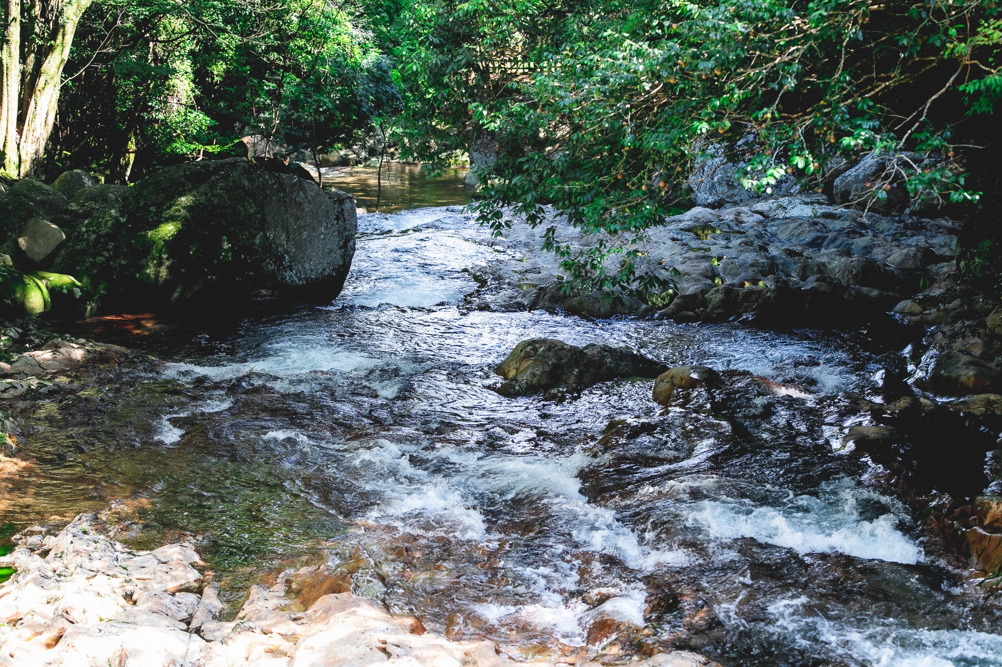 松野町は総面積のうち84%を森林が占めており、まさに「森の国」と呼ばれるに相応しいほどの大自然に囲まれています。四万十川の支流である目黒川の上流に広がる滑床渓谷は、侵食によって洗い清められた花崗岩の滑らかな河床が特徴です。滑床渓谷を囲む山岳部は降水量が多く水量が豊富。あめつちの恩恵を受け、苔やブナ林などの植物や動物、昆虫など多様性あふれる生き物が生息しています。