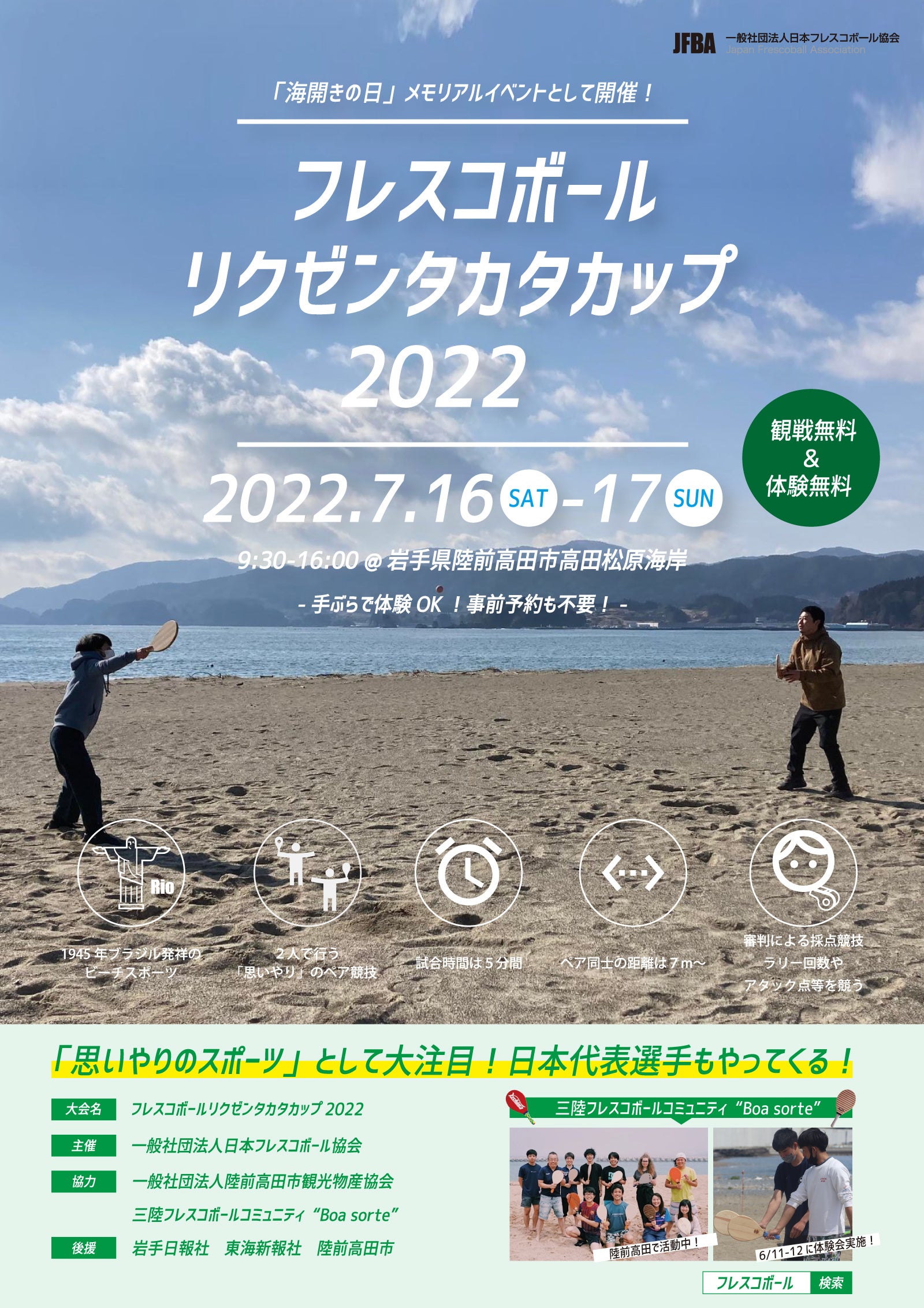日本フレスコボール協会(JFBA)、7/16(土),17(日)陸前高田市・高田松原海水浴場で開催の"海開きの日メモリアルイベント"「フレスコボールリクゼンタカタカップ2022」のエントリーをスタート。