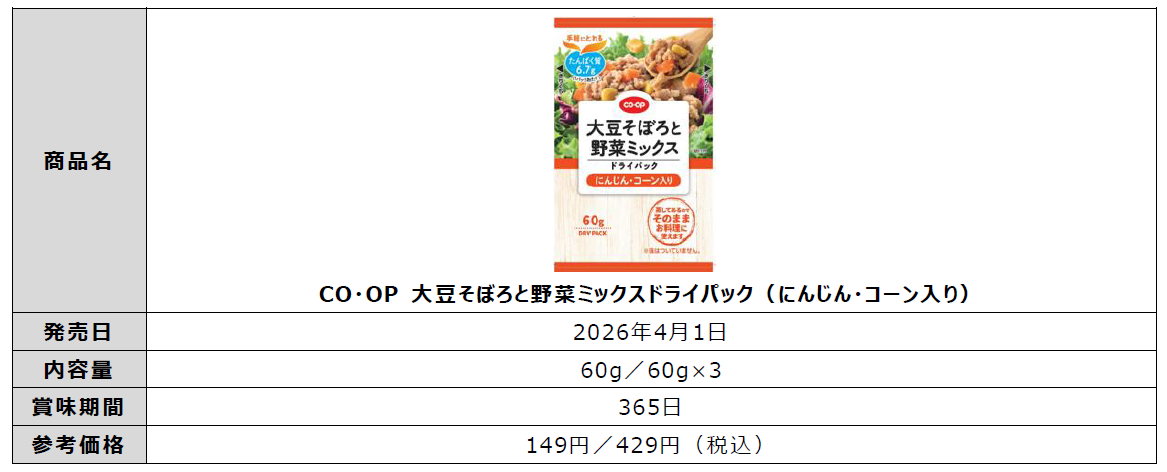 日本生活協同組合連合会(略称:日本生協連、代表理事会長:新井ちとせ)は、下ごしらえが不要で使いやすいドライパックシリーズから、「CO・OP 大豆そぼろと野菜ミックスドライパック(にんじん・コーン入り)」を2026年4月1日より発売します。