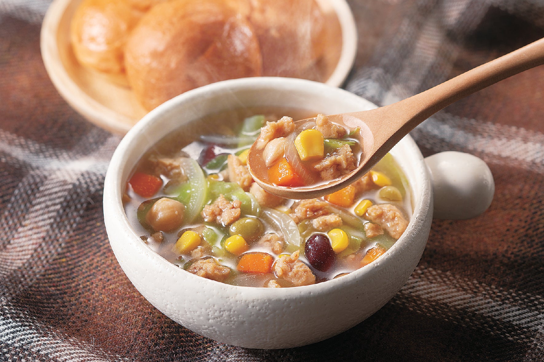 「CO・OP 大豆そぼろと野菜ミックスドライパック」は、そぼろ状にした大豆ミートと彩りの良い野菜をミックスした商品です。大豆たんぱくに加え、野菜も一緒にとることができ、組合員の「家族のために、健康でバランスのいい食事をしたい」という要望にお応えした、たんぱく質を手軽にとれる新商品です。