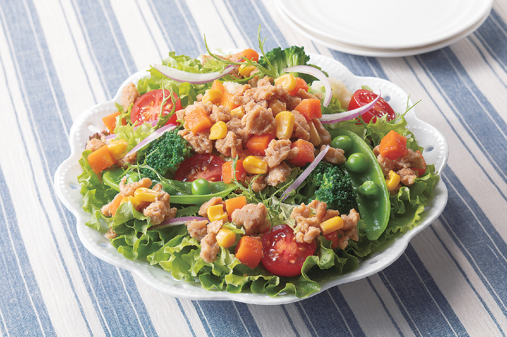 そぼろ状にした大豆ミートに彩りの良い野菜(にんじん・コーン)をミックスしました。水戻し不要で、袋から開けてそのまま使うことができ、手軽にたんぱく質がとれます。サラダやスープ、和え物などと組み合わせて少し手を加えるだけで、手軽に一品料理が完成します。