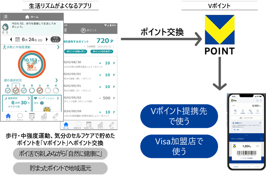 「生活リズムがよくなるアプリ」は、日立システムズが2022年2月からサービスを提供している、企業の健康経営を支援する「健康支援サービス(健康経営)」の従業員向けアプリケーションです。本アプリケーションは従業員一人ひとりの、からだとこころのセルフケアをサポートしており、歩行や中強度運動をすることや、気分のセルフケアを登録することでポイントを貯める機能を有しています。この度、貯めたポイントを、10ポイント→1ポイントのレートでVポイントに交換できるようになります。交換したVポイントは、日本全国のVポイント提携先や世界中のVisa加盟店での利用が可能です。