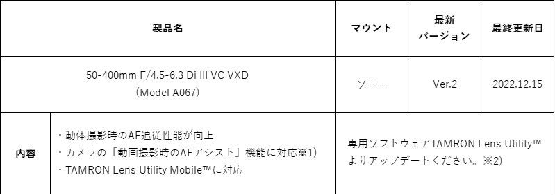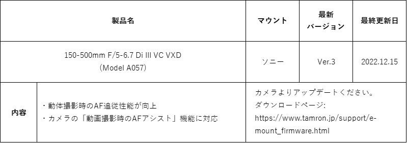 総合光学機器メーカーの株式会社タムロン(代表取締役社長:鯵坂司郎、本社:さいたま市)は、タムロン「50-400mm F/4.5-6.3 Di III VC VXD (Model A067)」、「150-500mm F/5-6.7 Di III VC VXD (Model A057)」ソニー Eマウント用のレンズファームウェアがアップデートしますことをご案内申し上げます。