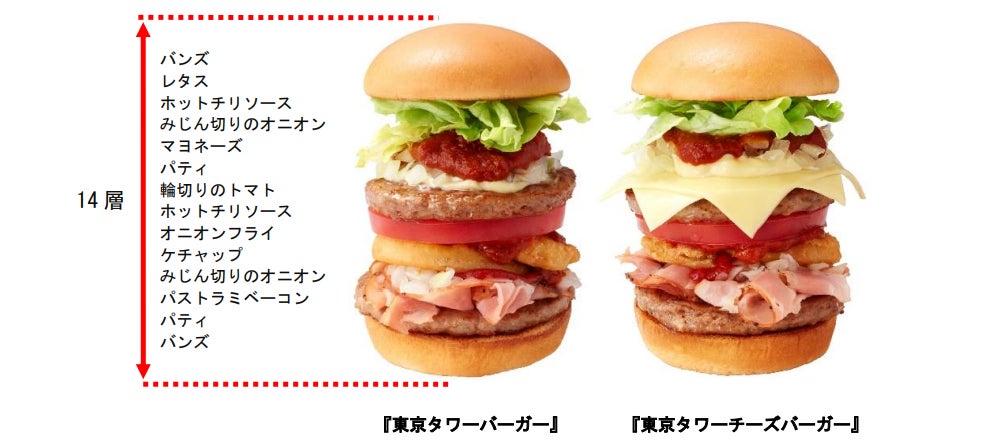 東京タワーをイメージしたモスバーガー史上最高の高さを誇る、東京タワー店限定の「東京タワーバーガー」と「東京タワーチーズバーガー」。