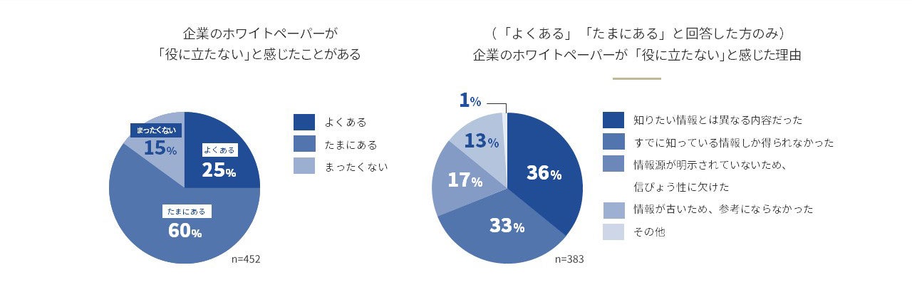 一方で企業のホワイトペーパーをダウンロードしたものの、「役に立たない」と感じたことのある人は全体の8割超にのぼりました。その理由として多かったのは「すでに知っている情報しか得られなかった」「知りたい情報とは異なる内容だった」という回答。