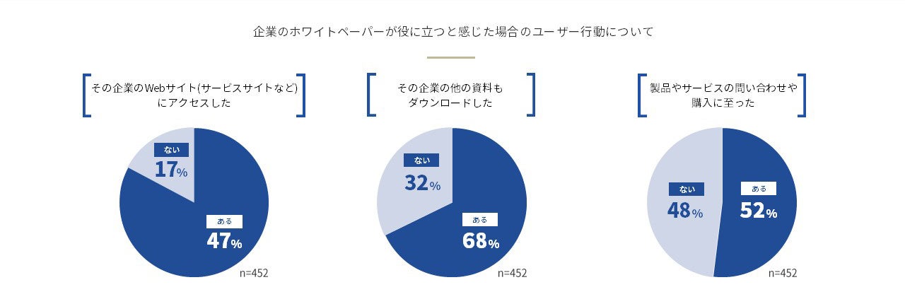 - 企業のホワイトペーパーが「役に立つ」と感じて製品やサービスの問い合わせや購入に至った人は52%と過半数を占める