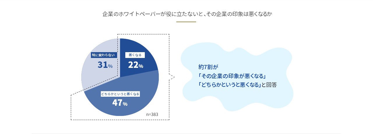 - ホワイトペーパーが「役に立たない」と感じた場合、69%が「その企業の印象が悪くなる」「どちらかというと悪くなる」と回答