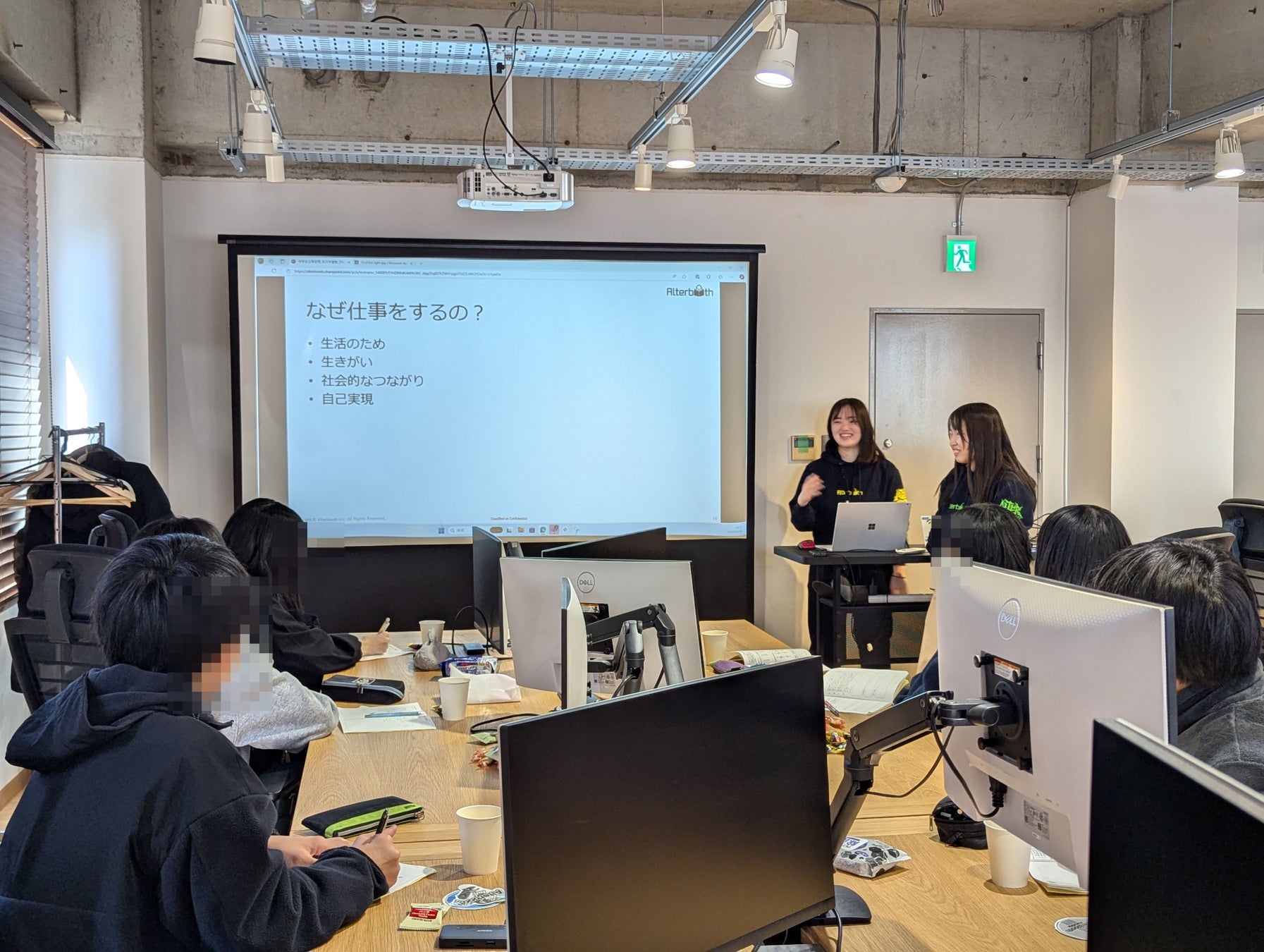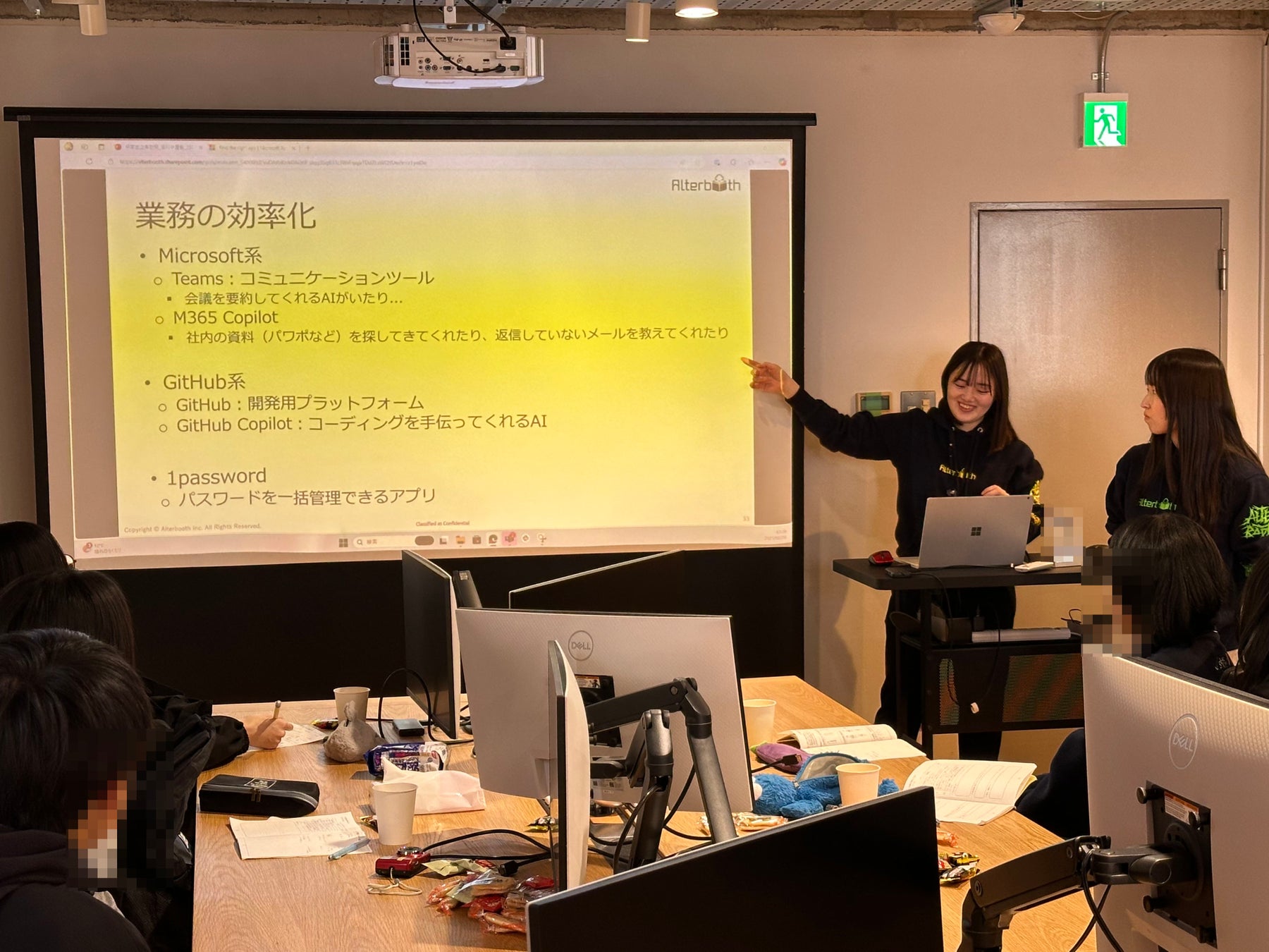 生徒たちは職場を見学し、その後、オルターブースの若手クラウドエンジニア2名がクラウドサービスについての説明や、エンジニアの仕事に至る進路選択について楽しく解説しました。さらに、学生たちが事前に用意していた質問にも丁寧に回答し、終始和やかな雰囲気の中で交流が行われました。