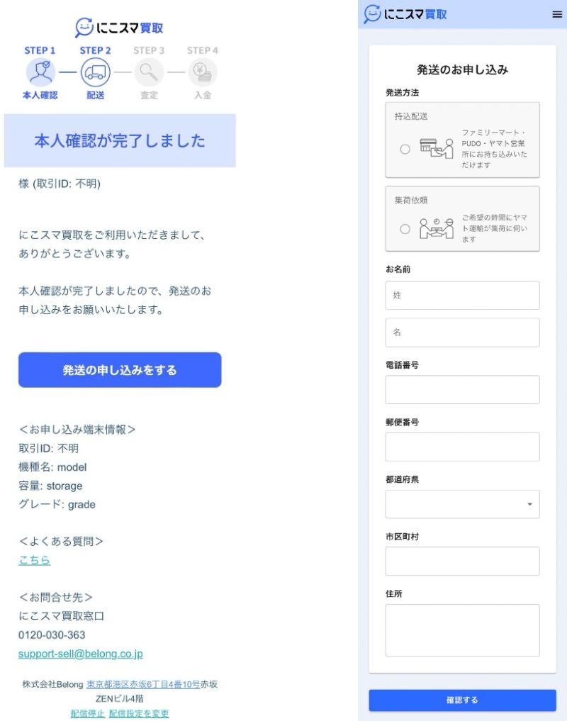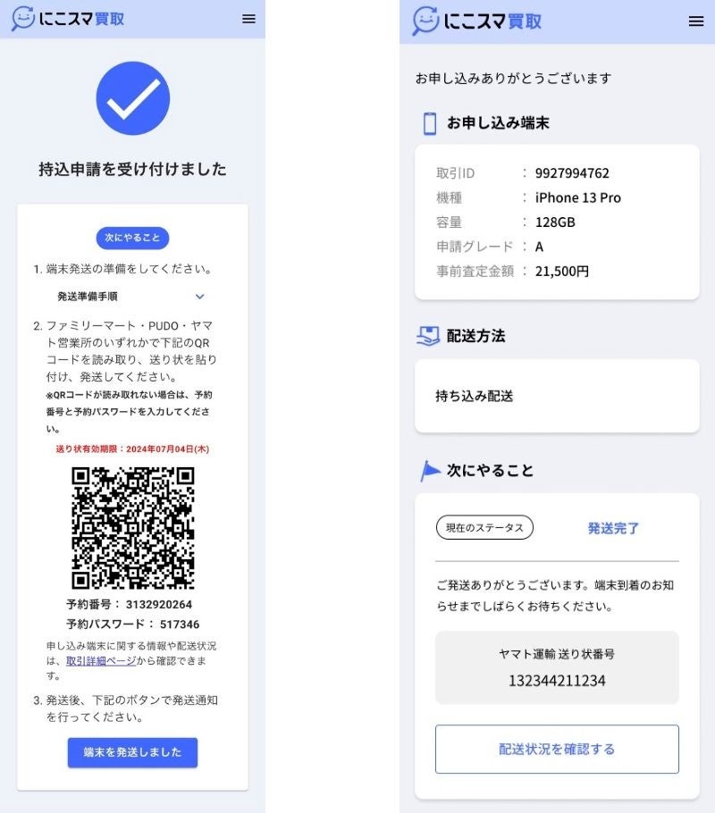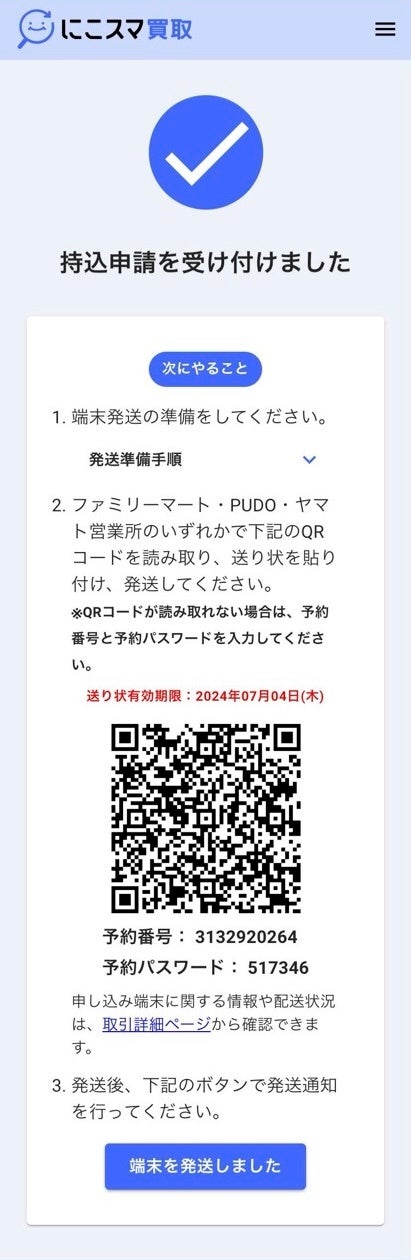 なお、買取端末の発送は、ファミリーマートやPUDO、ヤマト営業所への持ち込み・集荷の双方に対応しており、本人確認後に即時発行されるQRコードにより宛名書き不要で完了します。本機能は「にこスマ買取」公式サイトのほか、Amazon、メルカリなどのパートナーサイト経由の買取申込にも対応しています。