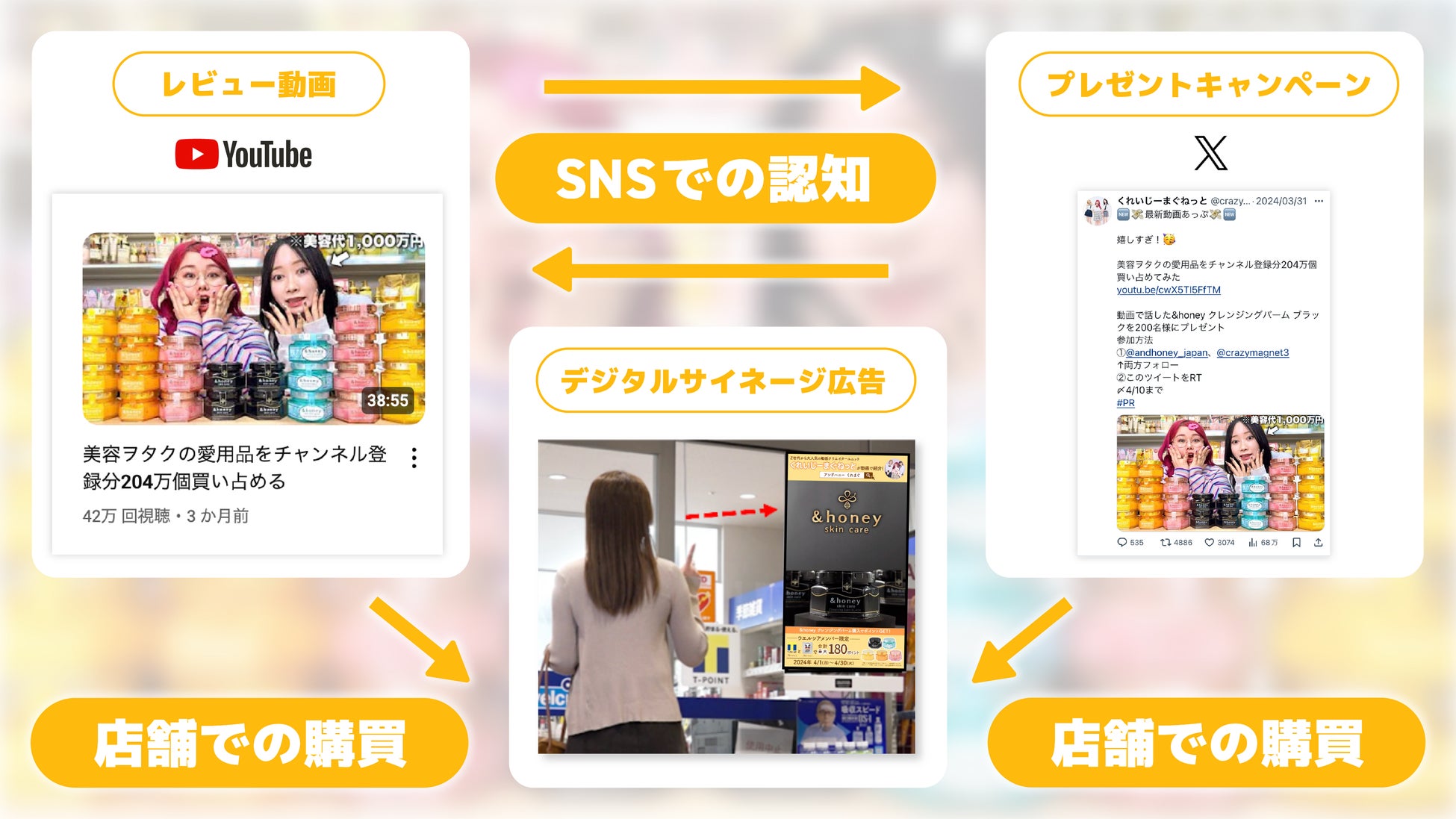 今回は、普段から&honeyを愛用しているくれいじーまぐねっとを起用したレビューYouTube動画やXでのプレゼントキャンペーンによって発話を増加させ、消費者の認知〜興味関心を起こしつつ、店舗でのポイントバックキャンペーンを示唆し、店舗への来店を促しました。