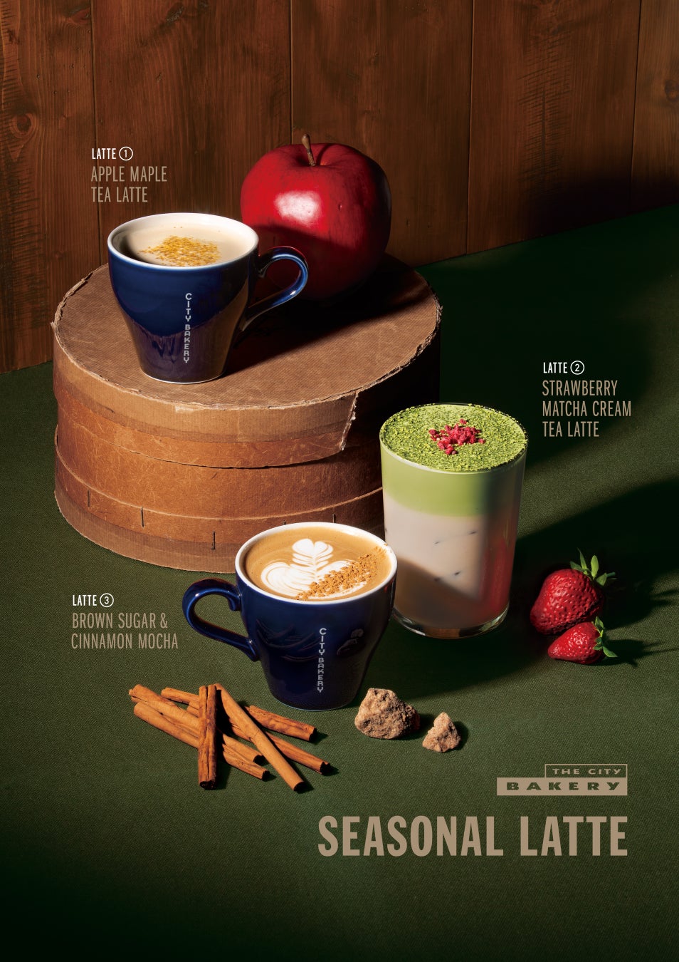 THE CITY BAKERYのSEASONAL LATTE、今年は「アップルメープルティーラテ」、「ストロベリー抹茶クリームティーラテ」、「黒糖シナモンモカ」の3種類。2024年9月19日(木)より、全国のバリスタが彩るラテタイムが始まります。秋冬、思い思いの一杯をお楽しみください!