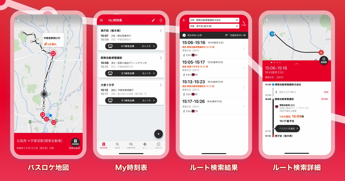 関東自動車株式会社(本社:栃木県宇都宮市、代表取締役社長:吉田 元、以下「関東自動車」)、株式会社みちのりホールディングス(本社:東京都千代田区、代表取締役グループCEO:松本 順、以下「みちのりHD」)、株式会社ナビタイムジャパン(本社:東京都港区、代表取締役社長:大西 啓介、以下「ナビタイムジャパン」)は、2023年7月18日(火)より、関東自動車の路線バスをより便利にご利用いただける「関東自動車バスナビ」アプリを正式リリースいたします(※)。