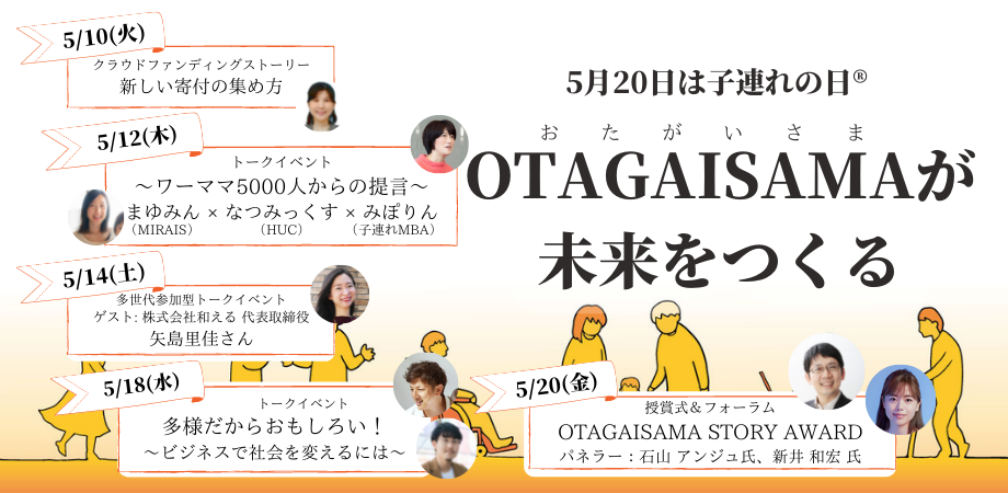 2022年の子連れの日(5月20日)にむけて、『OTAGAISAMA STORY AWARD』をはじめ、「おたがいさま」をテーマにしたコンテストやイベントを、子育て世代が中心となり企画運営しています。