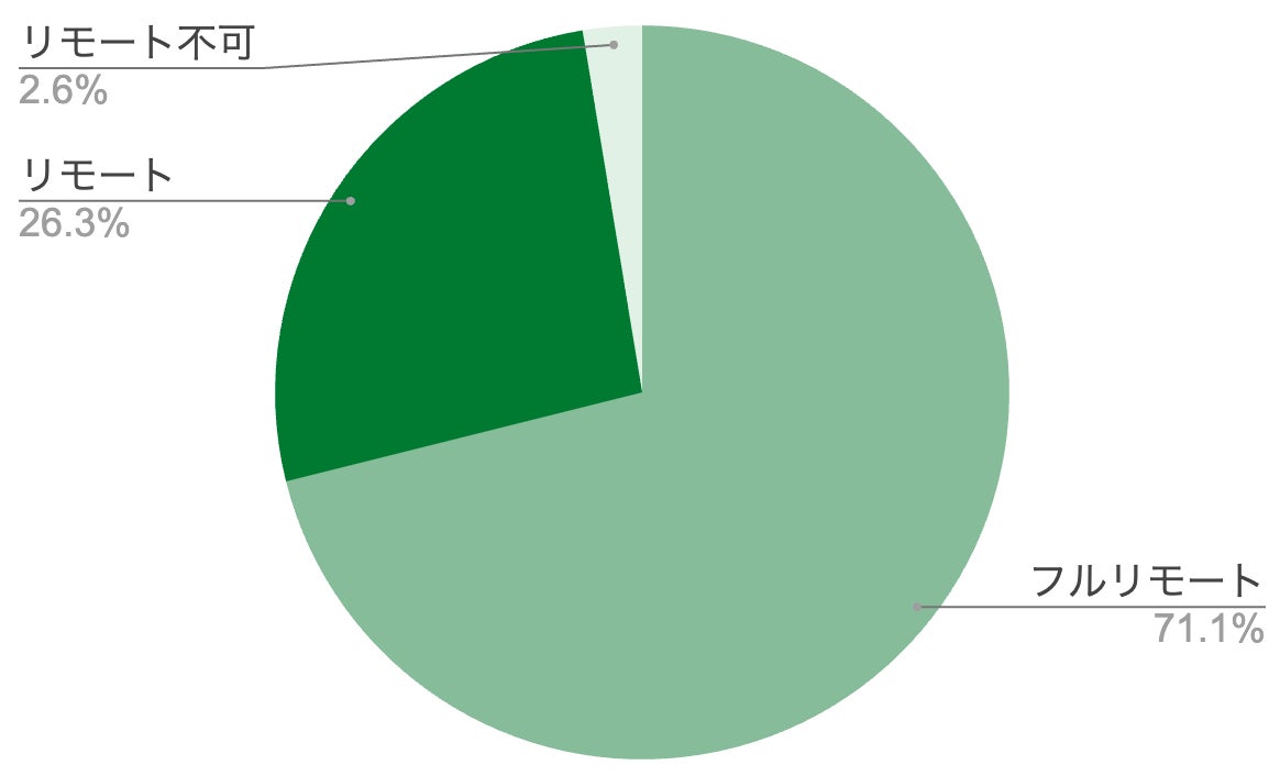 Node.jsの案件では、リモートワークが非常に一般的であることが明らかです。フルリモート(在宅OK)の案件が71.1%を占め、一部リモート可能な案件を合わせると97.4%に達します。