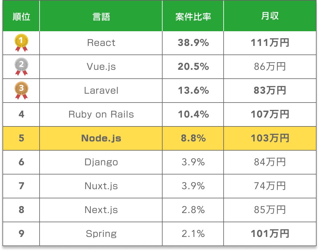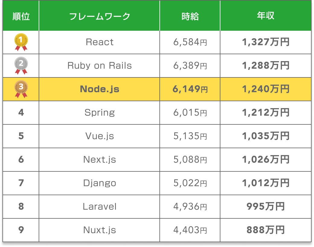 年収ランキング3位はJavaScriptフレームワークのNode.js|フリーランス副業調査