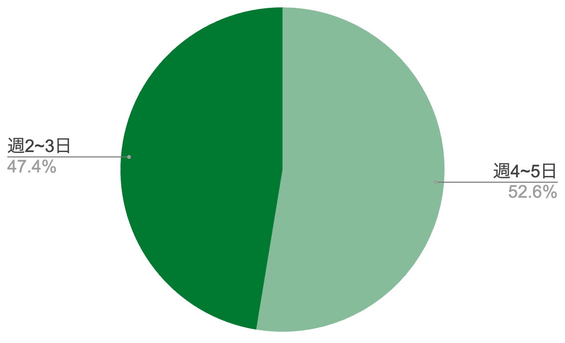 Node.jsエンジニアの稼働パターンは、週4〜5日と週2〜3日でほぼ二分されています。週4〜5日の稼働が52.6%とわずかに多いものの、週2〜3日の稼働も47.4%と高い割合を示しています。