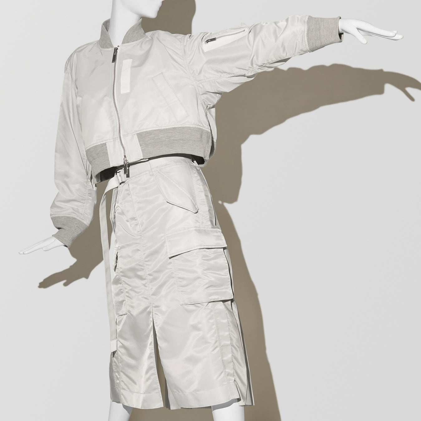 幅広い層から人気の<サカイ>より、クロップド丈が旬のMA-1ブルゾン、カーゴポケットがアクセントのスカートを、ともにバーニーズ ニューヨーク限定カラーであるライトグレーでお届けします。単品でももちろん魅力的ですが、セットアップで<サカイ>の世界観を全身で味わっても。<サカイ>が得意とする構築的なフォルム、そしてスカートの背面に配したプリーツが奏でる優雅な躍動感をぜひお楽しみください。