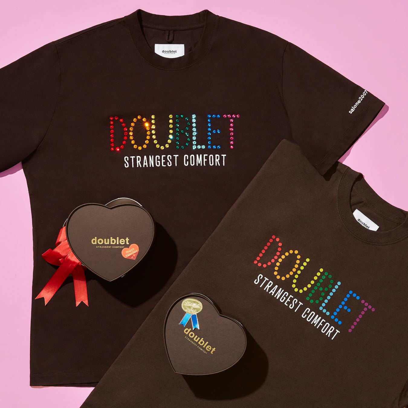 “違和感のある日常着”をコンセプト掲げる<ダブレット>。バレンタインの本命チョコと義理チョコをテーマに横浜店の地下にあるイタリアのリストランテ「SALONE2007」とタッグを組み、ボディとディテールに変化をつけた2種類のTシャツをバーニーズ ニューヨーク限定でご用意いたします。本命はクリスタルと刺繍で、義理はプリントでそれぞれロゴデザインを表現しました。Tシャツの左袖にはコラボレートを象徴する「SALONE2007」の店名がデザインされています。ともにハート型のギフトボックスにラッピングされたユーモアあふれる特別なアイテムに仕上がっています。