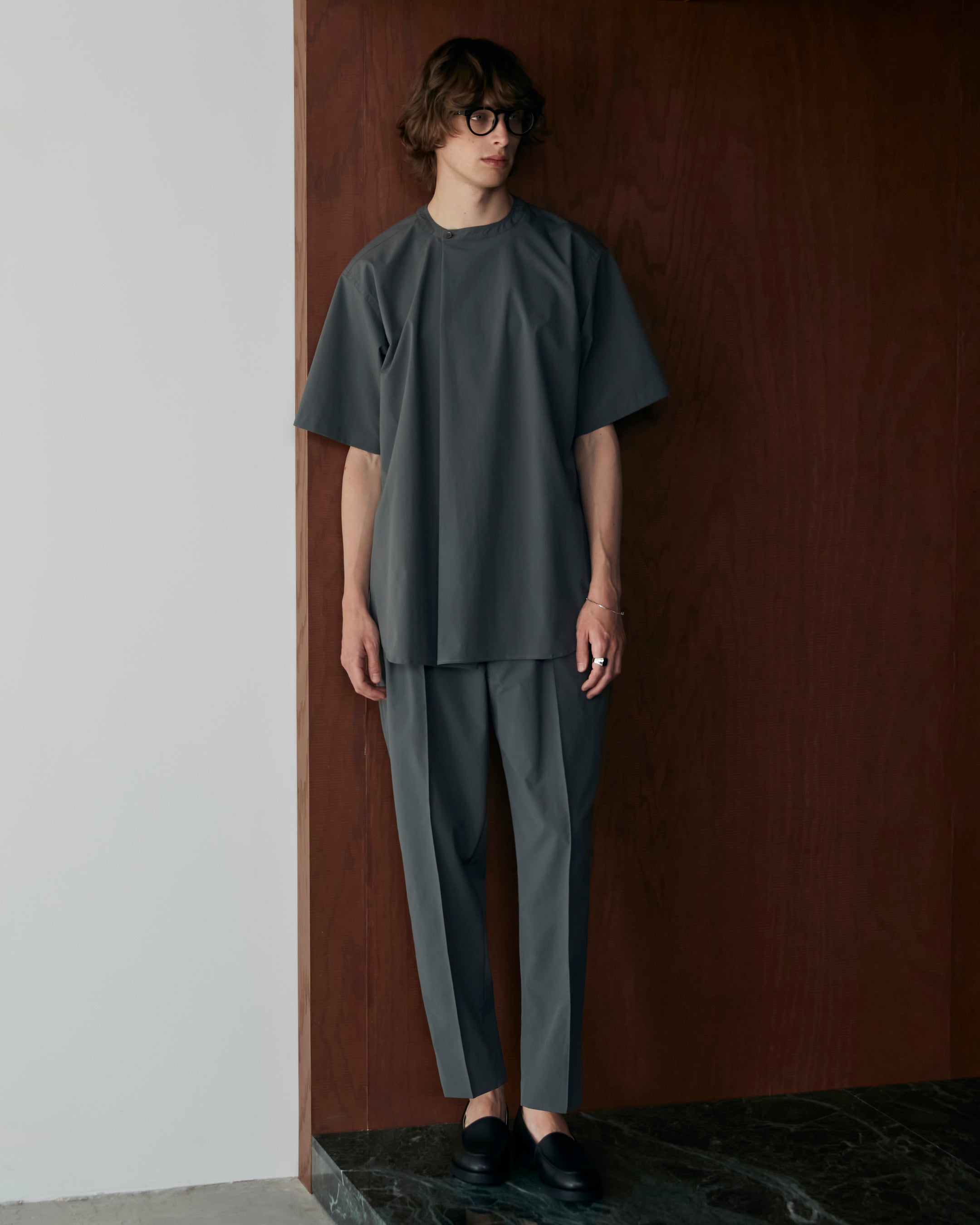 プリーツが随所に施されたプルオーバーシャツと、テーパードのかかった美しいシルエットのシャーリングトラウザースを別注作成。トップス前身頃のプリーツは、平面を畳むことで立体的なゆとりを形成 する「折り紙」から着想されています。ボトムスはドローストリングと脇ゴムにより、快適な穿き心地を実現。37.5TMテクノロジーを使用し、肌に密接した湿気の量に応じて衣服内環境を快適に保つよう働きかけてくれます。