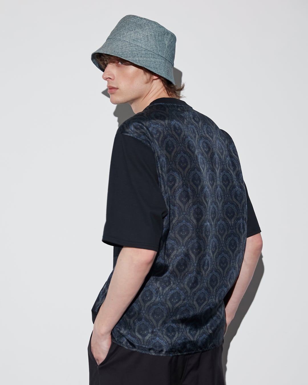 後ろ身頃を大胆に総柄のシルクで切り替えたシンプルなクルーネックTシャツ。前身頃はブラックカラーで、後ろ身頃にはネイビー調の総柄を採用しており、どんなコーディネートにも合わせやすい配色が特徴です。