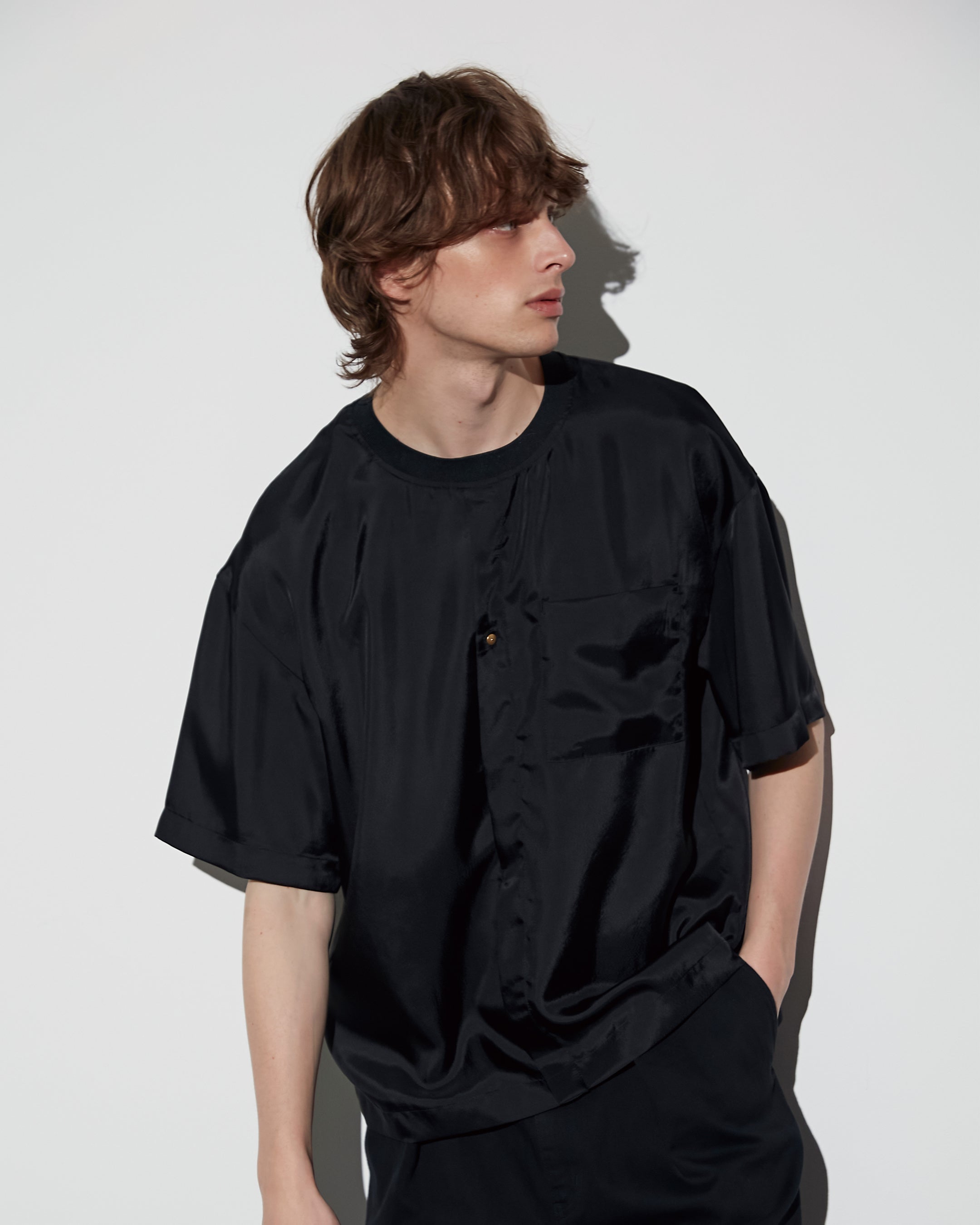 インラインの半袖Tシャツを生地別注したコラボレーションアイテム。 比翼仕立て風のフロントにゴールドボタンが付いたプルオーバーシャツです。 シルキーな素材を使うことにより、高級感のある仕上がりに。