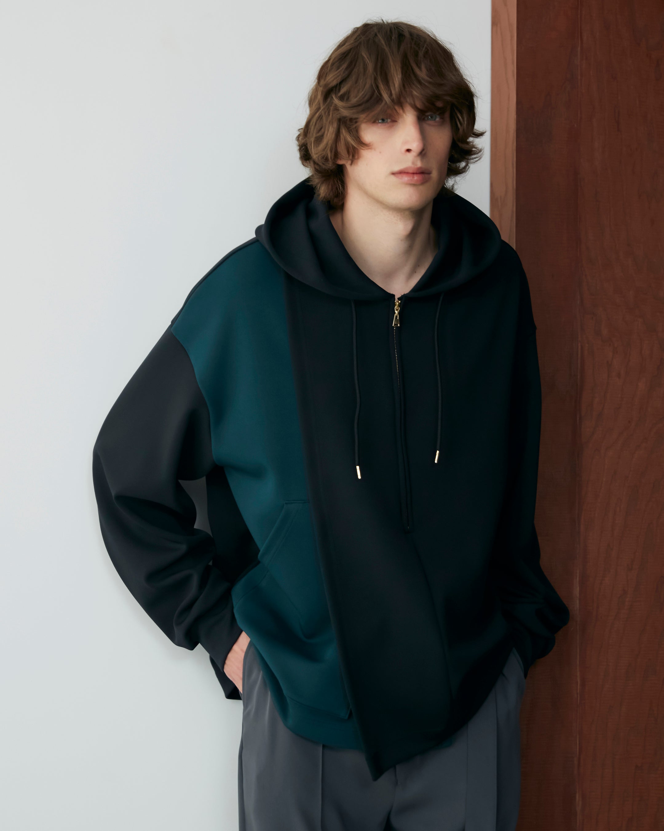 アシンメトリーデザインが目を惹くゆったりとしたフーディ―。パーカーというカジュアルなアイテムながら、上品な素材使いと落ち着いた配色で幅広いスタイリングに馴染む設計に。ゴールドの金具もワンポイントデザインとして機能します。