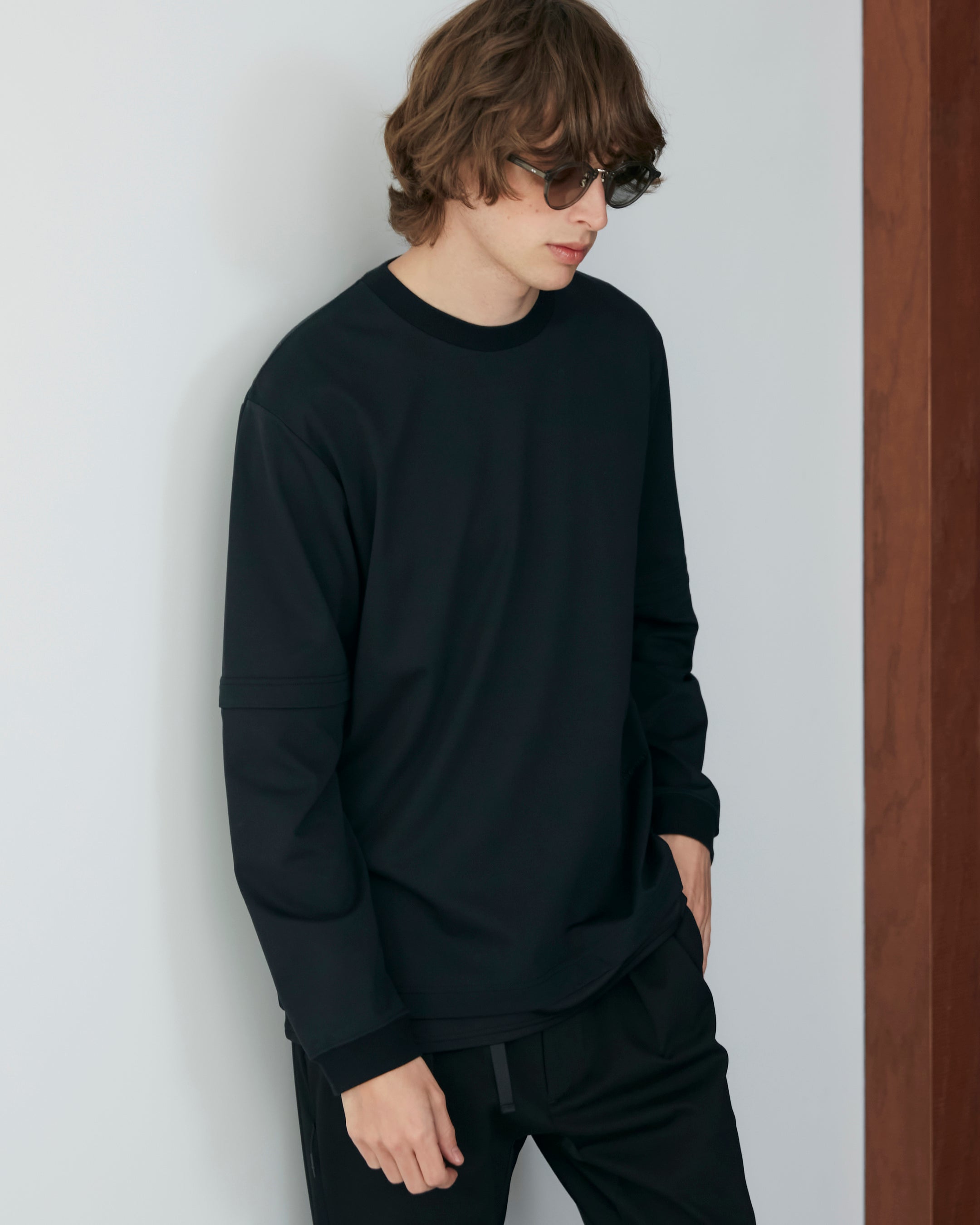 肘上のジッパーで半袖Tシャツになる2WAYの仕様になったロングスリーブのアイテム。後染め染色でキックバック性に優れたリバー組織を使用しています。左裾付近に施されたブランドロゴの刺繍もワンポイントのアクセントに。