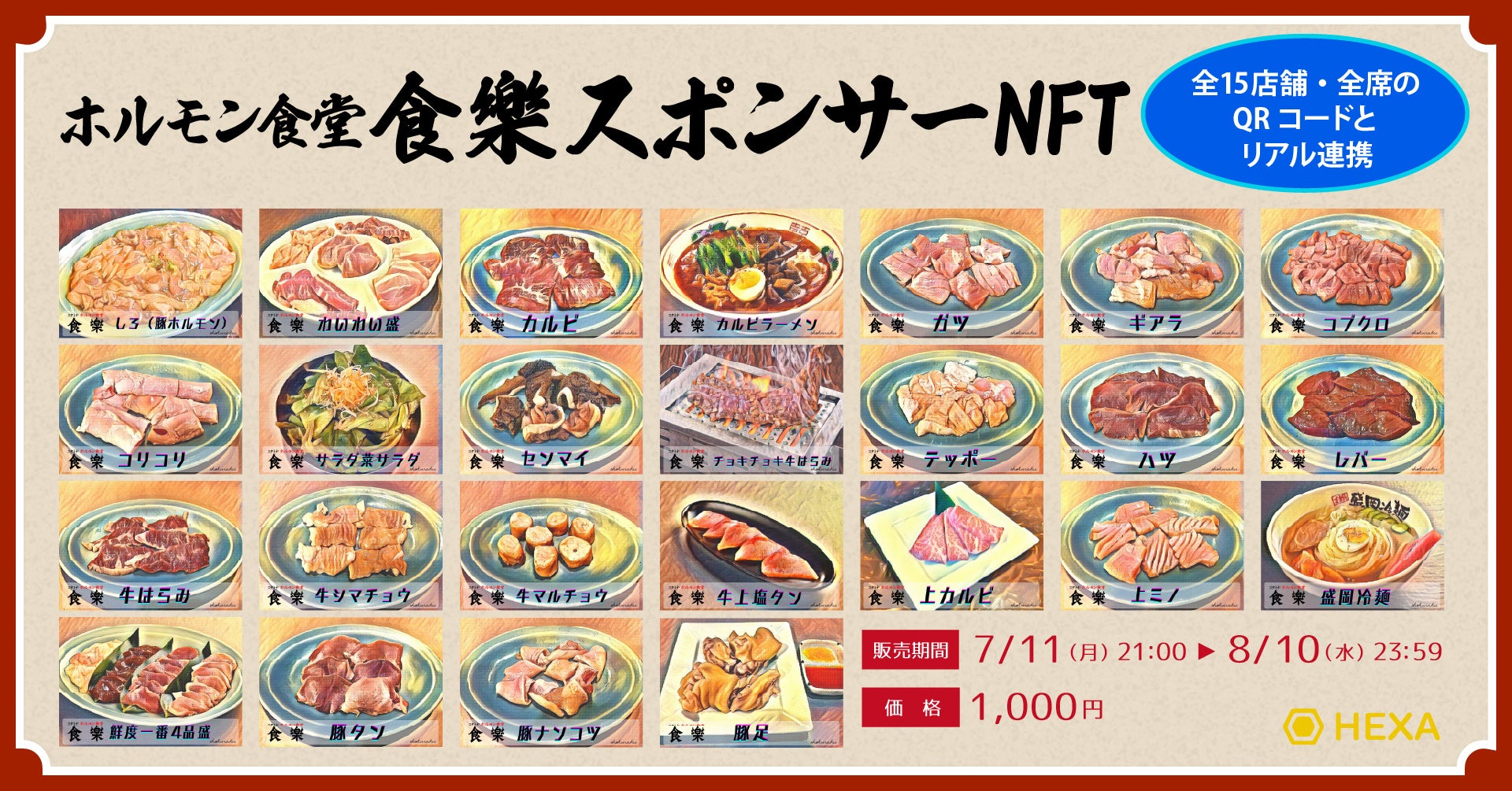 NFTマーケットのHEXA(ヘキサ)では、岩手・宮城・福島で15店舗(2022年6月現在)を展開するホルモン食堂「食樂」のメニュースポンサーNFTを7/11(月)21時から販売します。