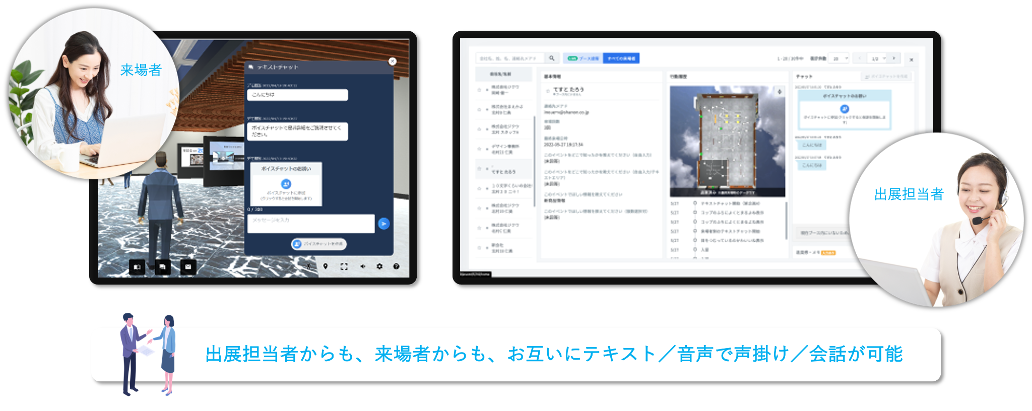 テキストチャットまたは音声チャットにより、出展企業、来場者の双方から話しかけが可能です。これにより対面の展示会と同様のコミュニケーションが行えます。