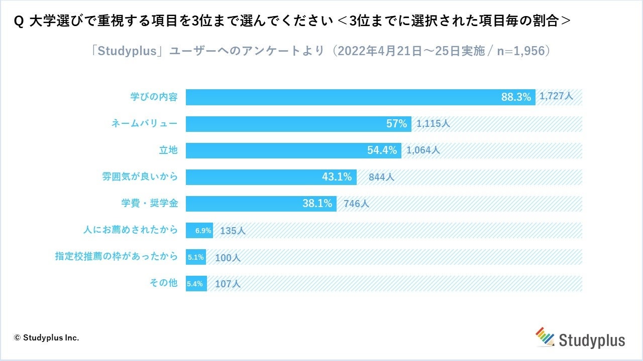 スタディプラス株式会社(本社:東京都千代田区、代表取締役:廣瀬高志、以下スタディプラス)は2022年4月21日~25日にかけて、学習管理アプリ「Studyplus」上で高校1年生から高校3年生のユーザーを対象に「大学選びに関するアンケート」を実施、1,965人から調査に対する回答を得ましたので概要をご報告します。