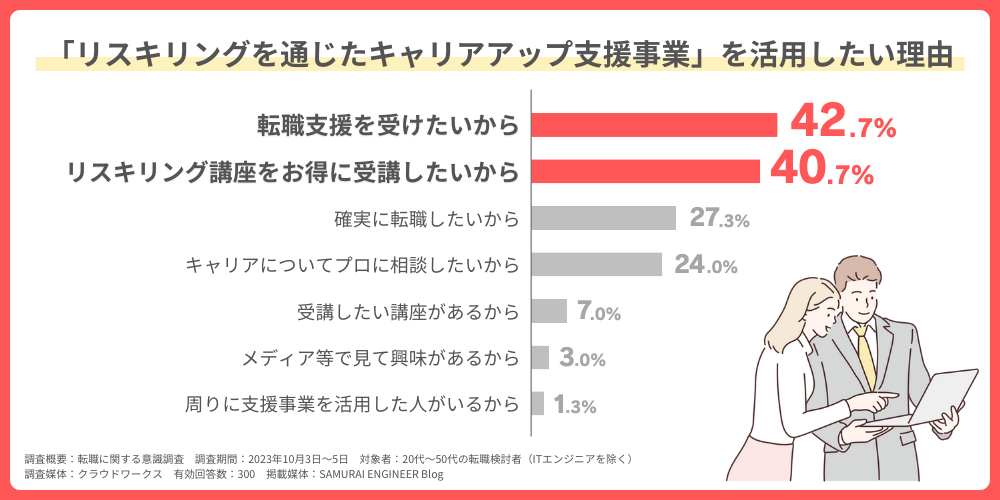 認知度の低さに反し、本支援事業を活用したいと考える人が多かった理由の一つは「転職支援を受けたいから」でした。また「リスキリング講座をお得に受講したいから」との回答も次いで多数となりました。