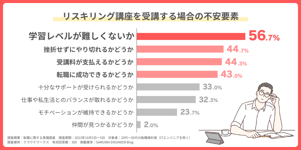 最も多かった回答は「学習レベルが難しくないか」で56.7%、次いで「挫折せずにやり切れるかどうか」、「受講料が支払えるかどうか」、「転職に成功できるかどうか」という現実的な観点に回答が集まりました。