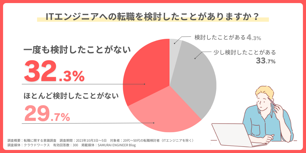 IT人材不足が叫ばれる現代の日本において、そもそもITエンジニアへの転職を検討したことがない人が多数であることが明らかになりました。