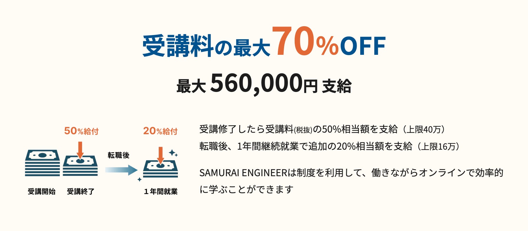 SAMURAI ENGINEERでは、受講料の最大70%(最大56万円)の支給を受けられます