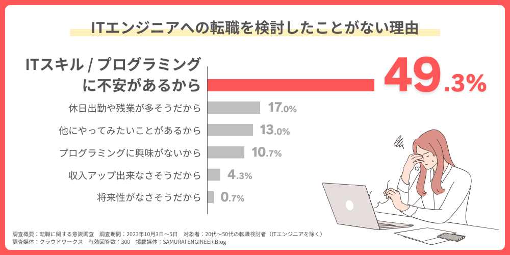 ITエンジニアへの転職を検討したことがない理由として、約半数である49.3%の人が「ITスキル / プログラミングスキルに不安があるから」と回答しました。