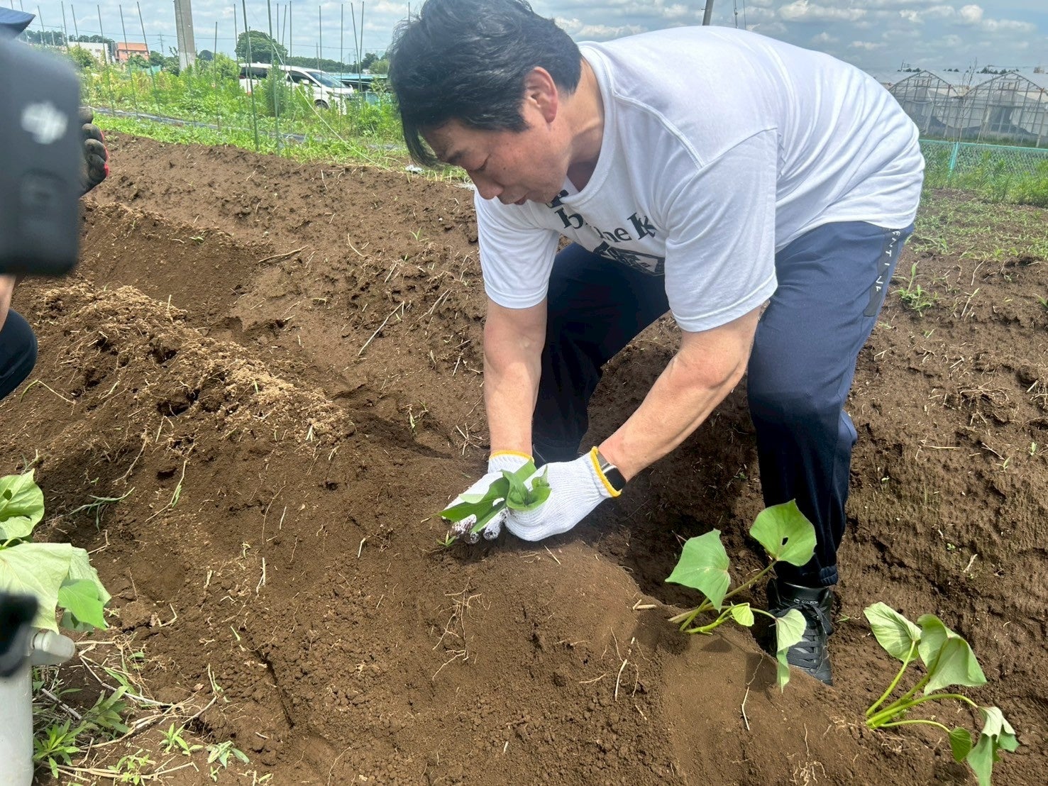 さつまいも博実行委員会と一緒に「剛腕いも」栽培。山川名誉実行委員長と握りこぶしポーズ。