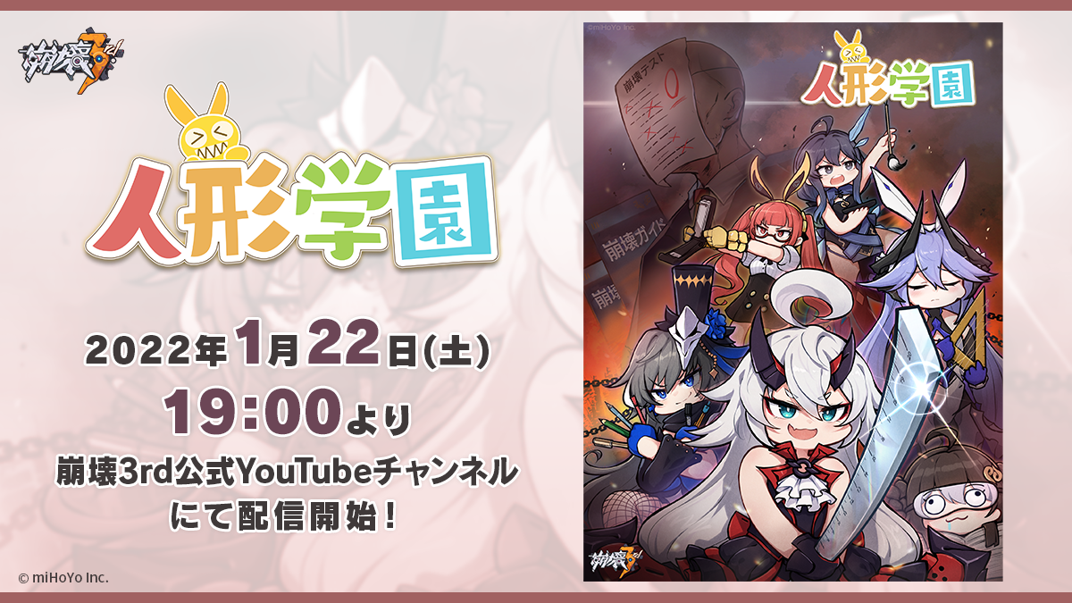 株式会社miHoYo(本社:東京都渋谷区、代表取締役社長:李 承天)は、スマートフォン・Steam向け本格3Dアクションゲーム『崩壊3rd』のスピンオフショートアニメ『人形学園』を、1月22日(土)19:00より、崩壊3rd公式YouTubeチャンネルにて配信することを発表いたします。