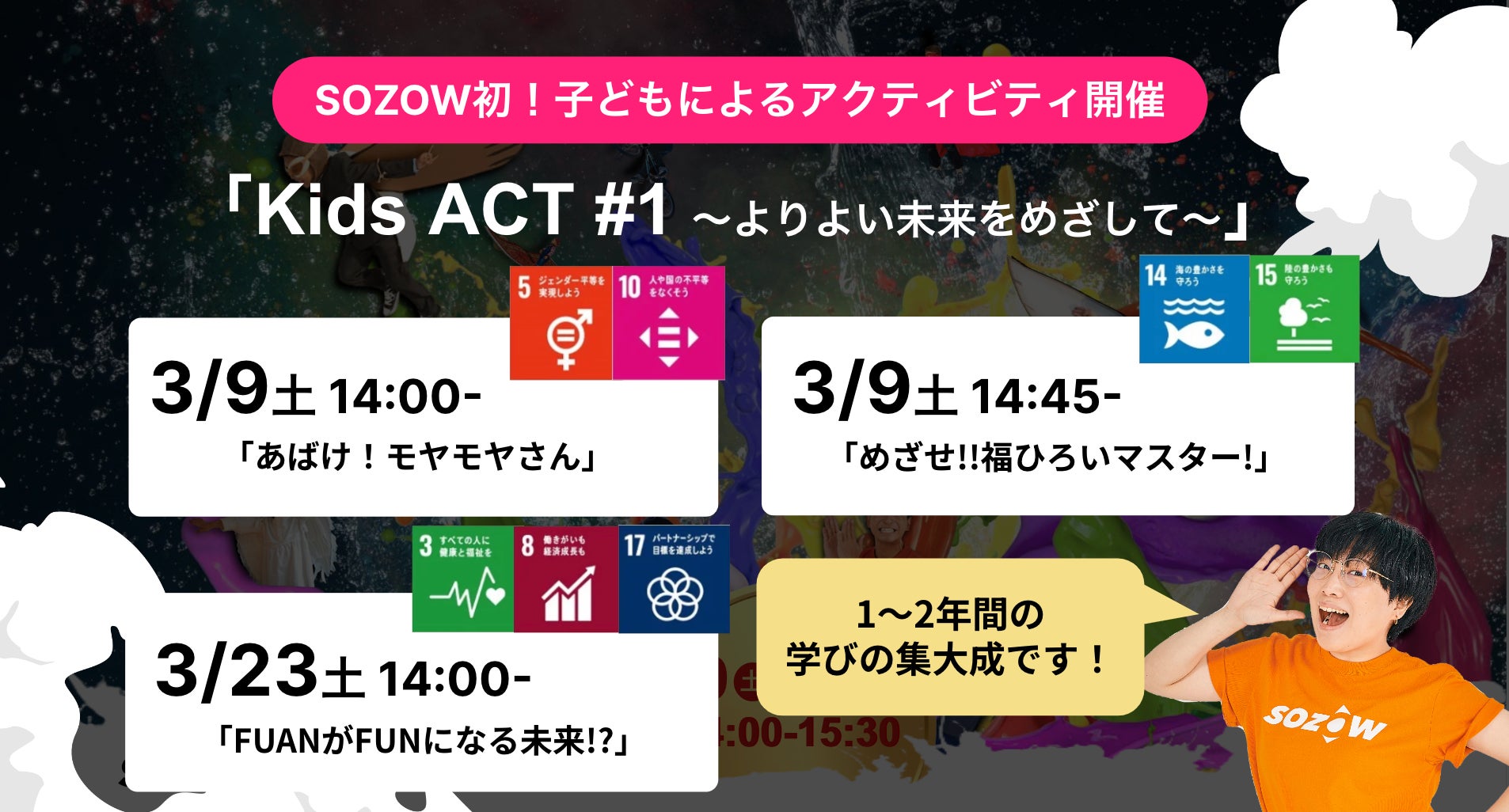 SOZOW株式会社(所在地:東京都品川区、代表取締役:小助川 将)は、「みんなで考えるSDGsの日」である3月17日(日)を迎えるにあたって、SOZOWでSDGsについて学んできた小中学生による「SDGs達成のために今一人ひとりができること」をテーマにしたオンラインイベント『Kids ACT #1〜よりよい未来を目指して〜』を開催します。