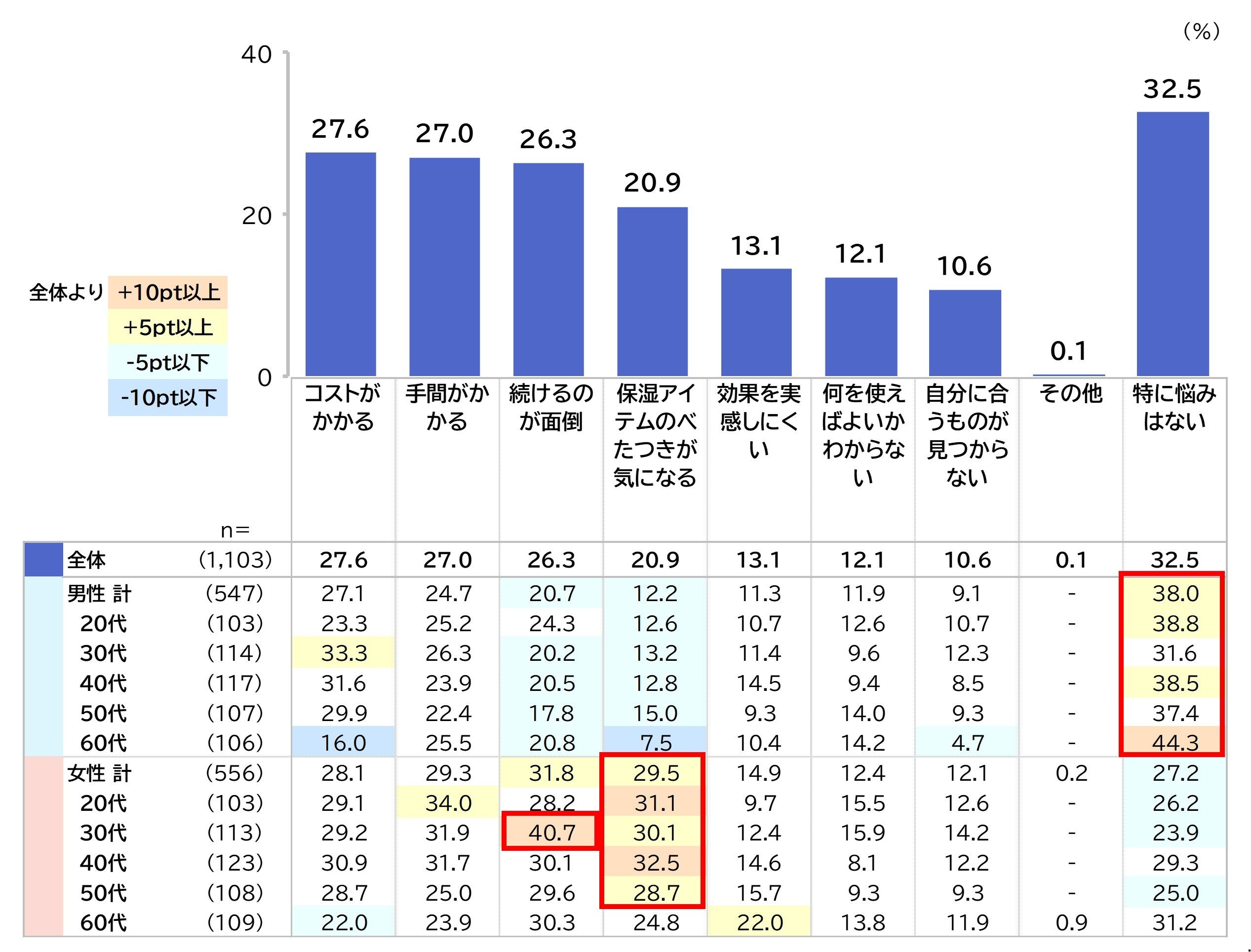 全体では「特に悩みはない」が32.5%と最も高く、特に男性ではすべての年代で高い傾向です。女性では「保湿アイテムのべたつきが気になる」が20代~50代で高くなっています。また、「続けるのが面倒」が30代で高くなりました。