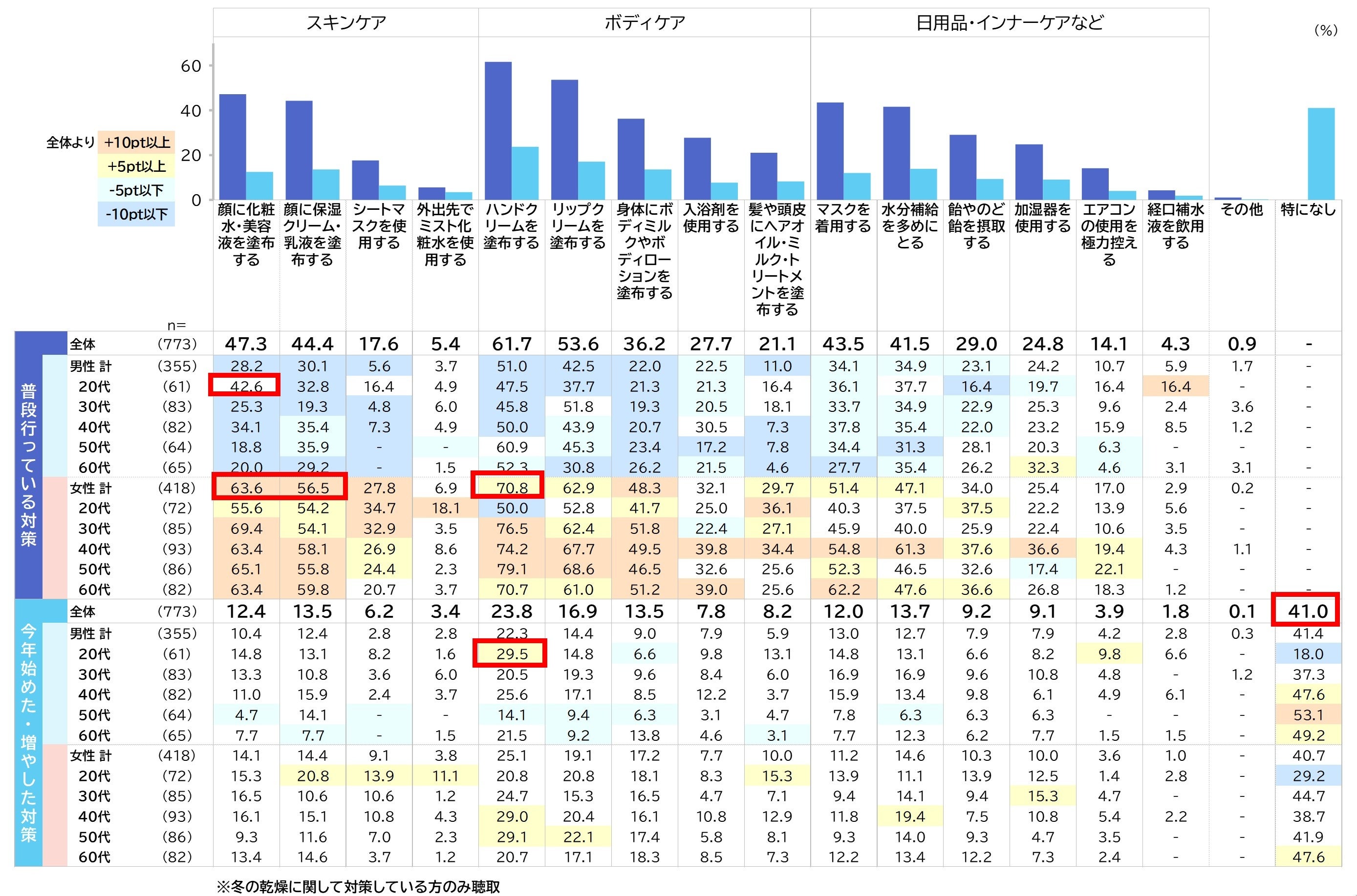 普段行っている乾燥対策で、全体で最も高いのが「ハンドクリームを塗布する」61.7%。今年始めた、増やしたものでは「特になし」が41.0%と最も高くなった。男性は女性と比べて対策していない人が多いが、20代では「顔に化粧水・美容液を塗布する」が42.6%と他の世代より高く、今年始めた、増やしたものでは、「ハンドクリームを塗布する」が29.5%と高くなっており、「顔」「手・指先」への乾燥対策が若い世代でされはじめている。女性の普段対策しているものは、「ハンドクリームを塗布する」が70.8%、「顔に化粧水・美容液を塗布する」が63.6%、「顔に保湿クリーム・乳液を塗布する」が56.5%と「顔」「手・指先」への対策をばっちりしている。