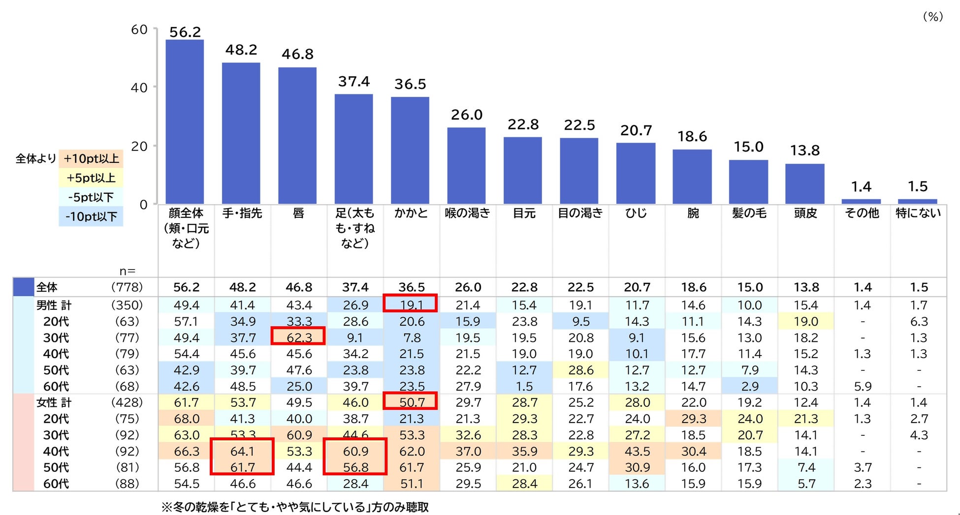 全体で最も高いのは「顔全体」56.2%で過半数の人が気にしています。男性では、30代で「唇」が62.3%と突出して高くなっています。女性では、40代・50代で「手・指先」「足(太もも・すねなど)」が30代以前より高くなっています。「かかとは男性が19.1%、女性が50.7%と差が最も大きくなっています。