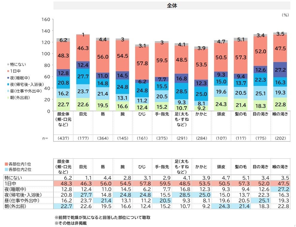 乾燥が気になる時間帯は、すべての体の部位で「1日中」が最も高くなっています。