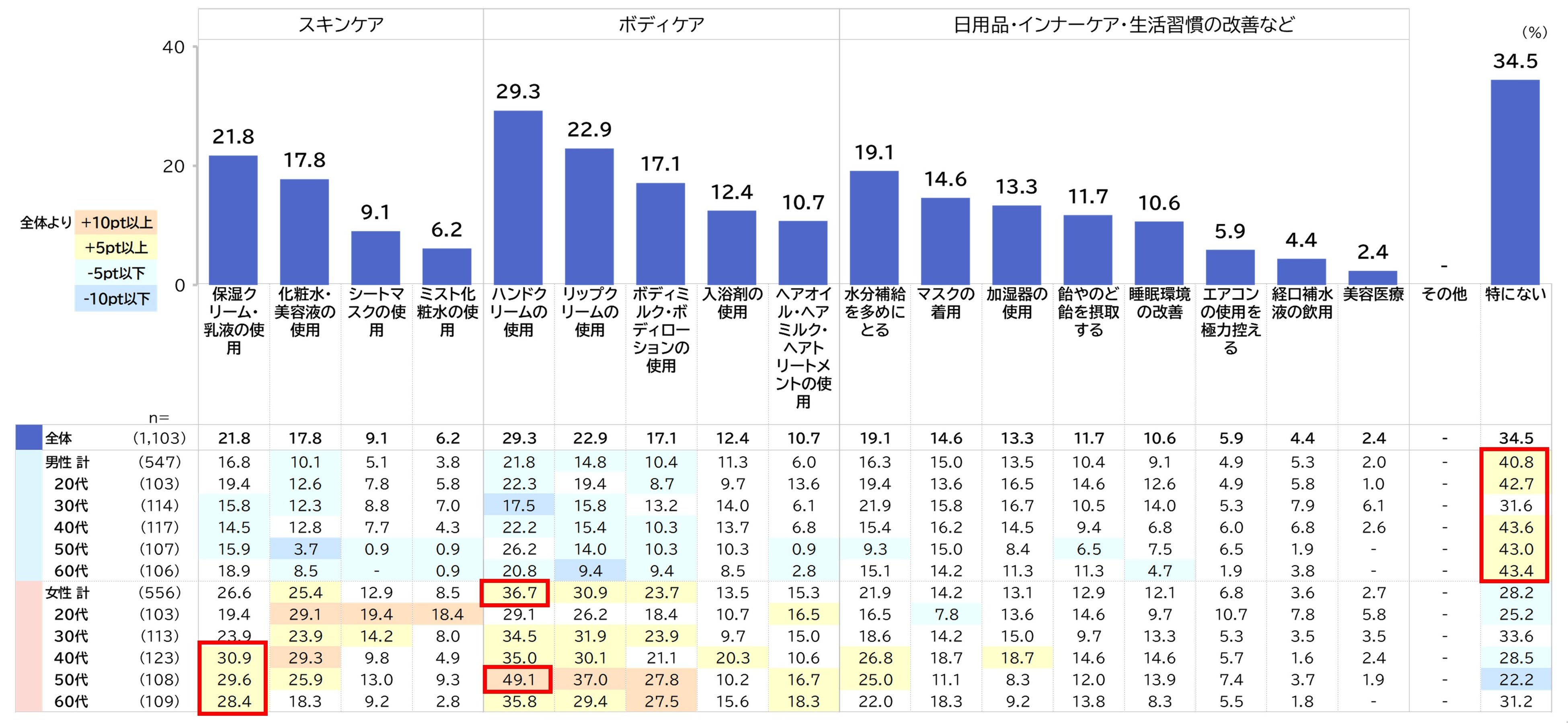 全体では、「特にない」が34.5%と最も高く、特に男性がすべての世代で高くなっています。女性では、「ハンドクリームの使用」が36.7%で最も高く、特に50代で49.1%と高くなっています。また、女性40代~60代で「保湿クリーム・乳液の使用」が30代以下より高くなっています。