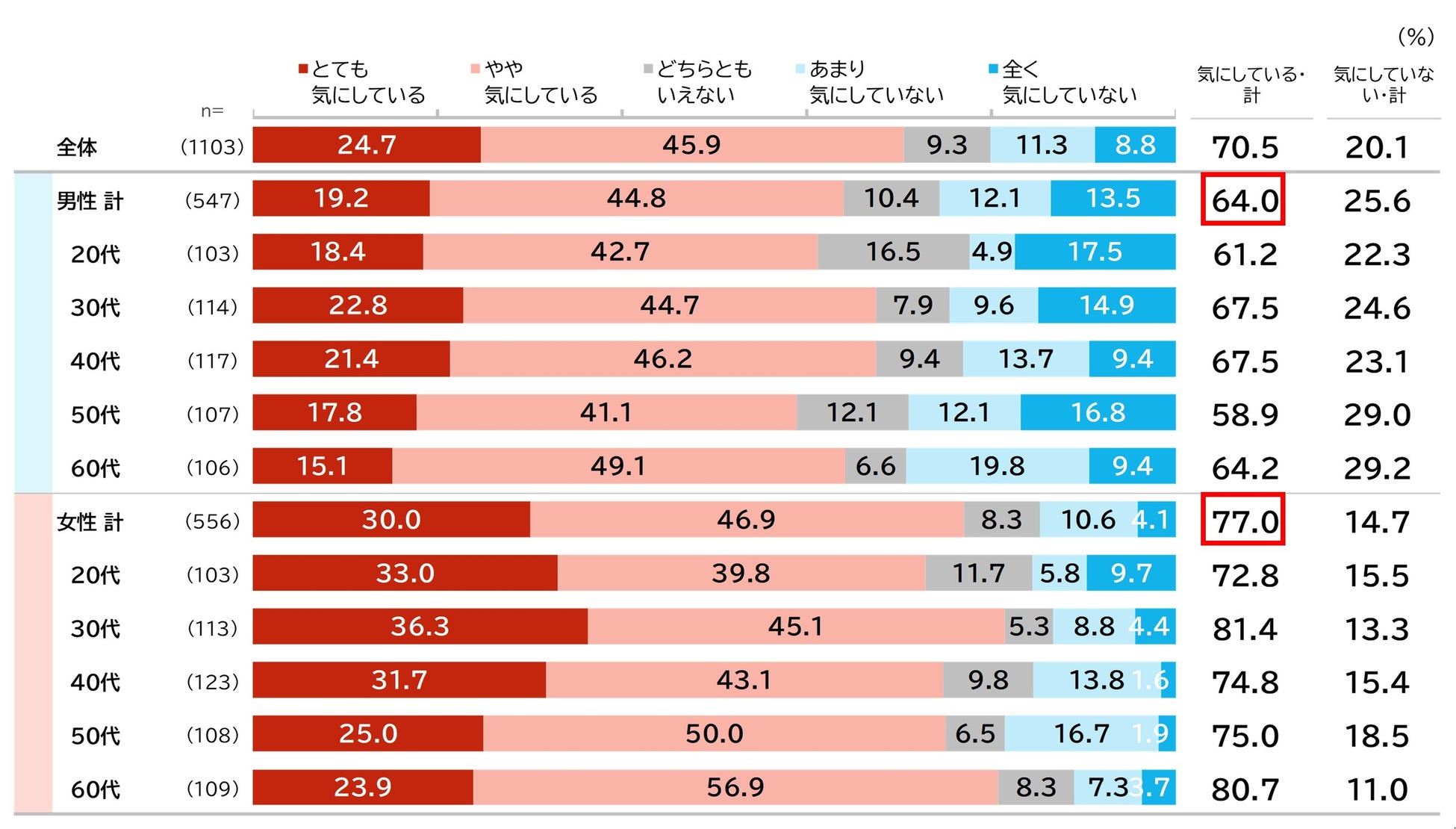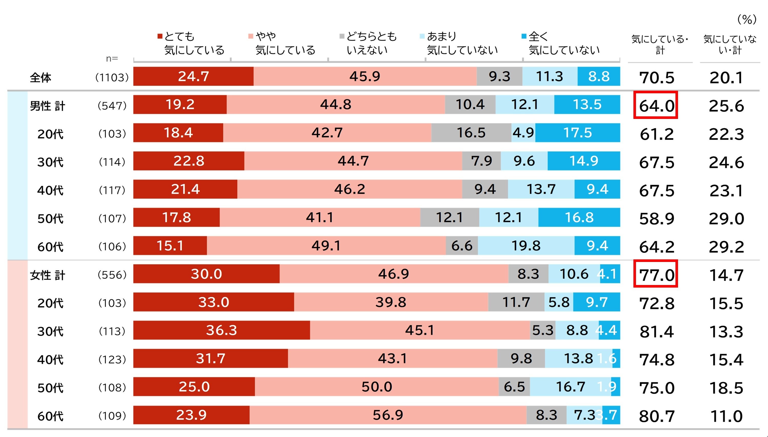 全体では、乾燥を気にしている計が70.5%と乾燥への意識は高いです。性別ごとに見ると、男性が64%、女性が77%と、男性より女性の方が意識が高くなっています。