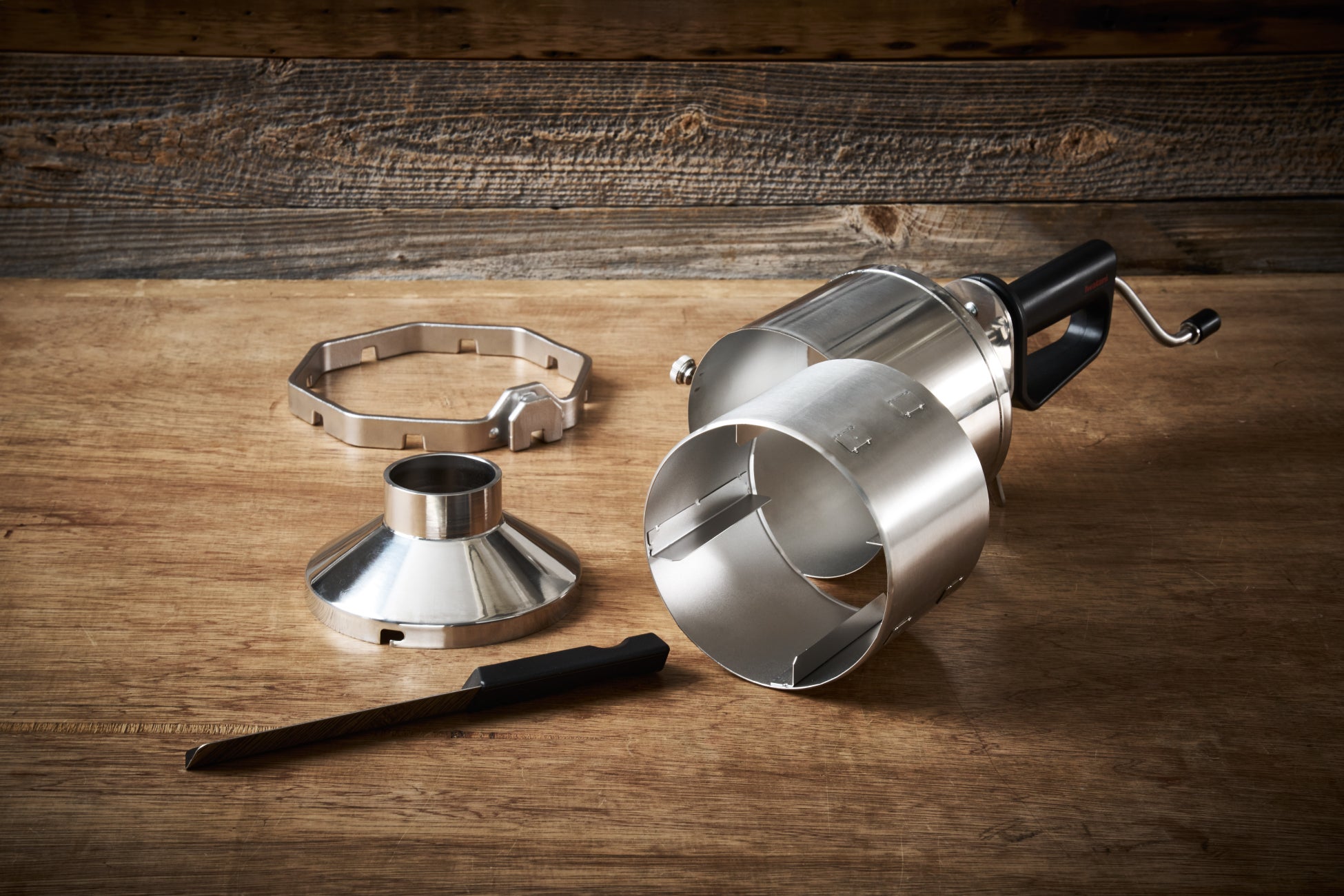 本体を支える「差込板」や、シリンダーと回転ハンドルの間に「グリップ」があることで、焙煎後の
