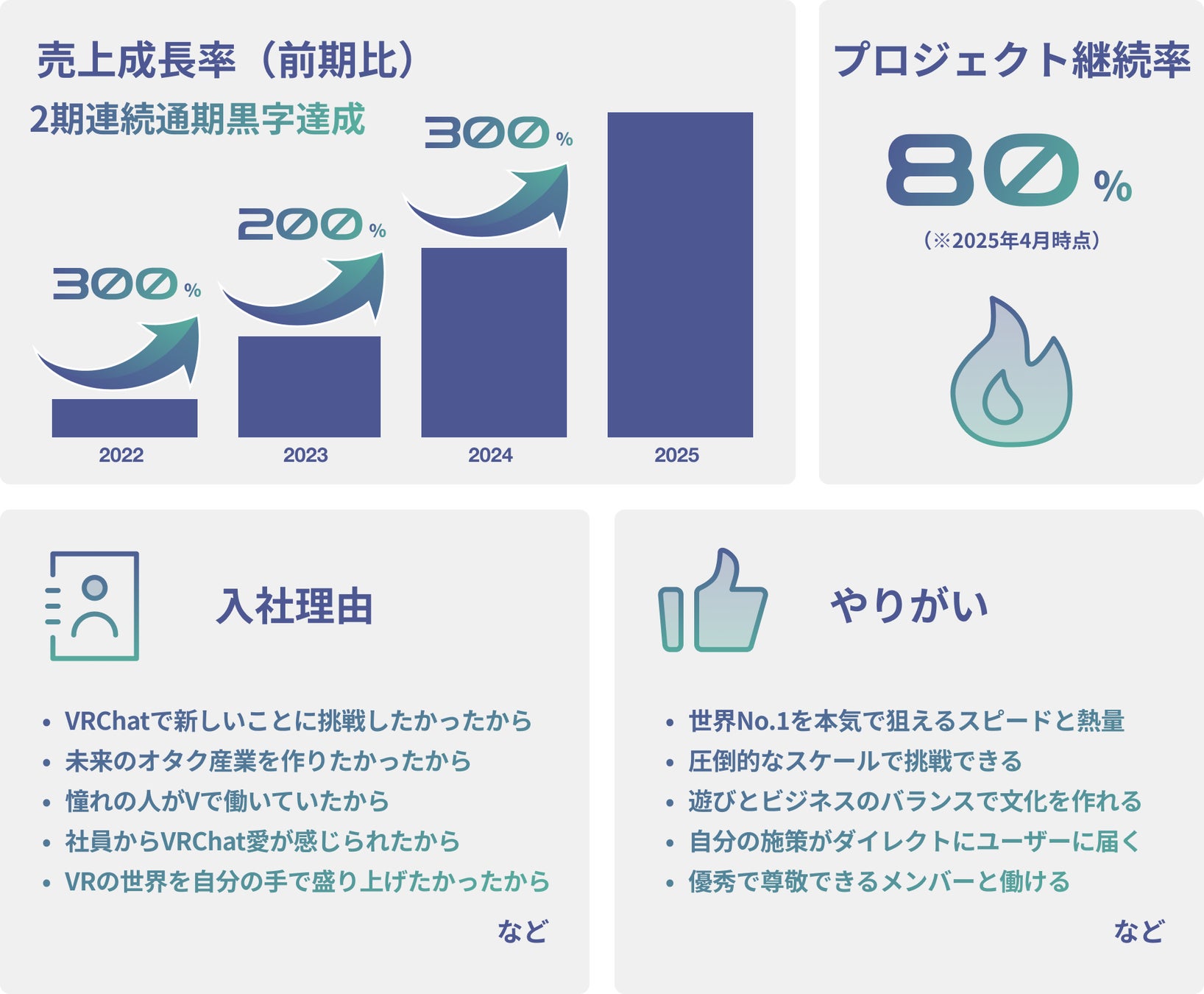 「VRChatの延長線上で新しいことに挑戦したい」「憧れていたV業界の人々と働きたい」「働くメンバー自身がVRCユーザーで、VRCへの深い愛を感じた」「XRを通じてお客様の課題を本気で解決したい」「ユーザー主体で文化を盛り上げたい」といった声が寄せられています。