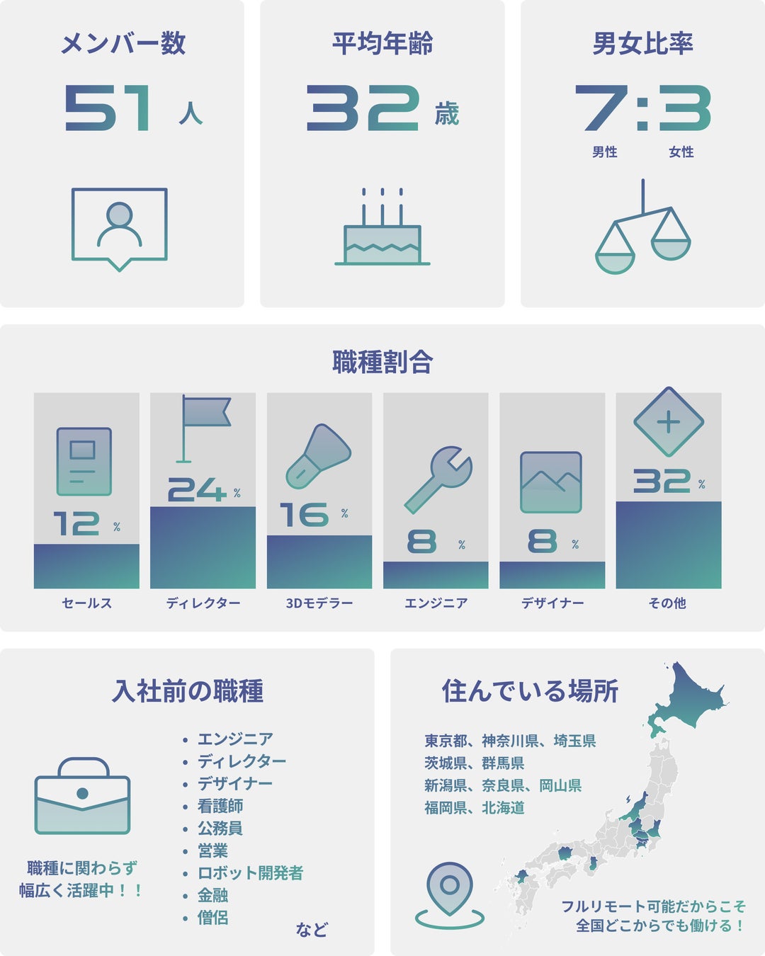 社員一人ひとりの「職種」や「VRChatとの関わり方」などの、Vならではのユニークなデータを深掘りし公開いたしました。