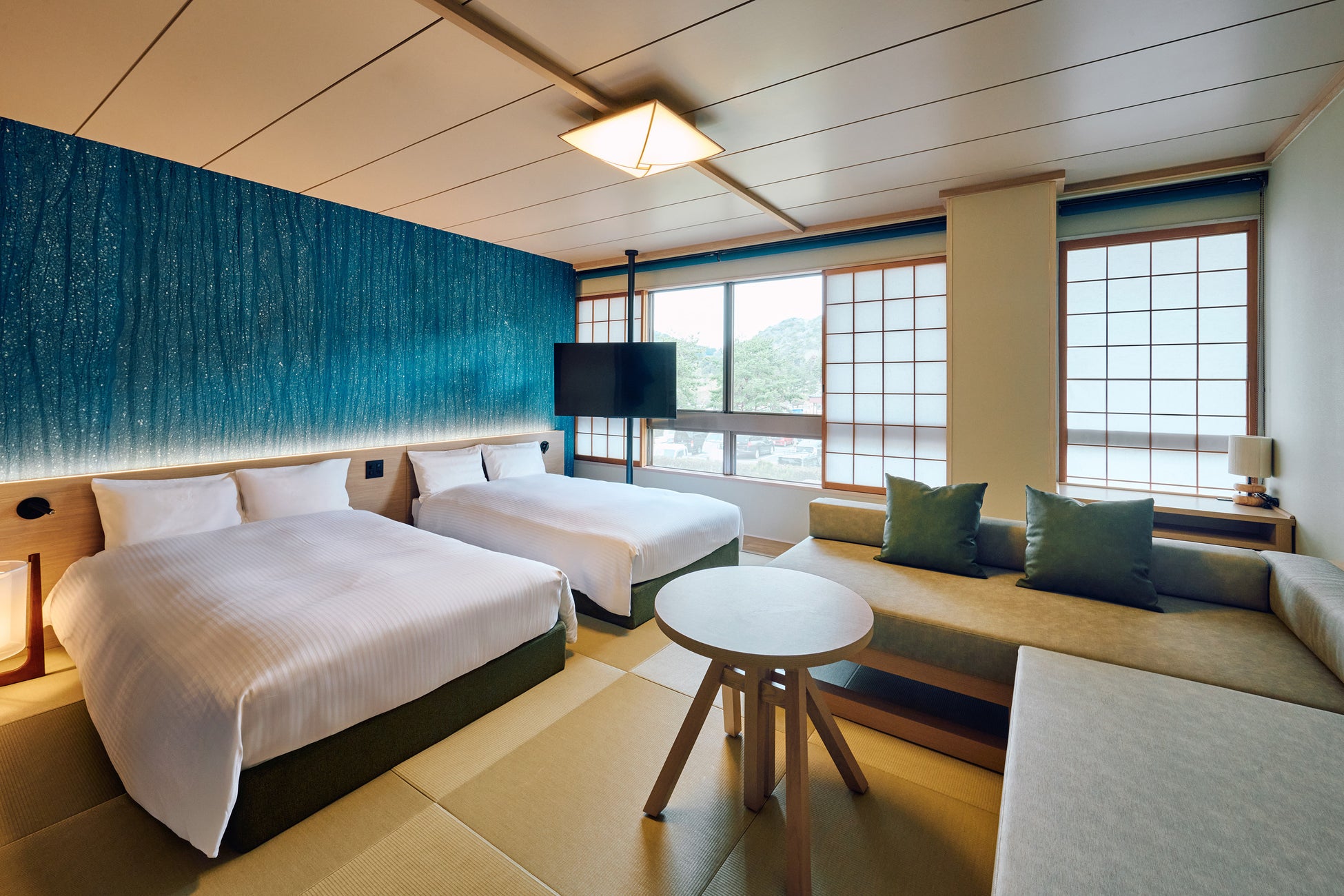 るり渓の六季折々の美しさと、奈良時代より和歌や文を綴るときに使われてきた京都の伝統工芸品「京からかみ」をモチーフにした趣のある旅館です。客室は京からかみのアートワークとベッドを設え、落ち着きを感じる和洋室タイプのお部屋へ生まれ変わりました。館内にはご宿泊者様だけが利用できる貸切風呂や季節の会席料理を楽しめるレストランもリニューアル。