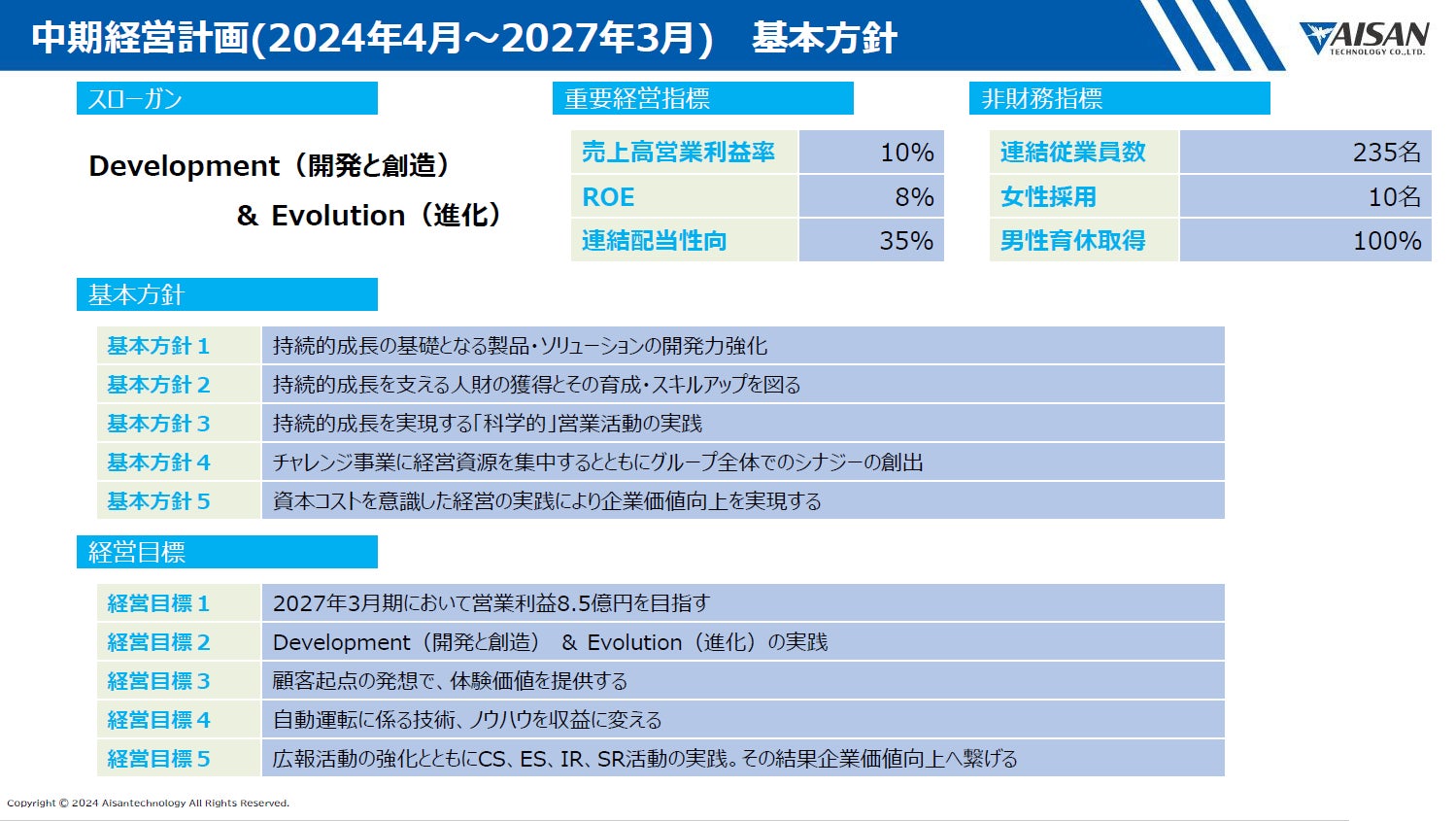 前中期経営計画であるInvestment&Innovationを経て、「既存事業の価値の最大化と新たな価値の創造」に取り組むべく、Development &Evolutionのスローガンを掲げ、2027年3月期に売上高80億円、営業利益8.5億円の目標達成に向け取り組んでまいります。