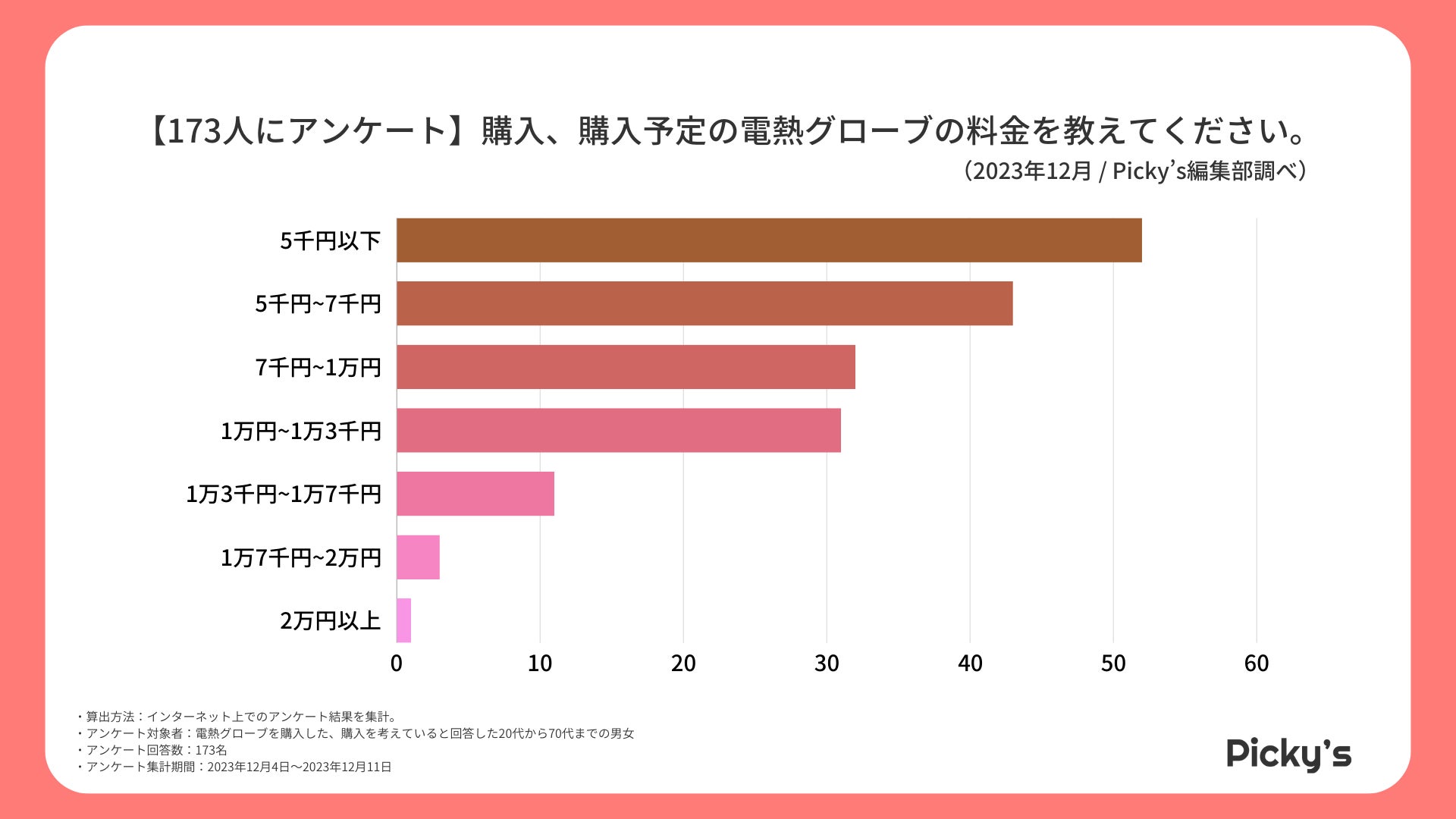 アンケート結果を見ると、電熱グローブの価格帯は広いことが分かります。1位の「5千円以下」から、2位、3位と続く「5千円以上1万円以下」の帯域が特に人気です。手頃な価格で購入できることが、多くの購入者にとって重要な要素となっているようです。それに続いて高価なものも存在しますが、全体的に手ごろな価格帯が支持されているようです。